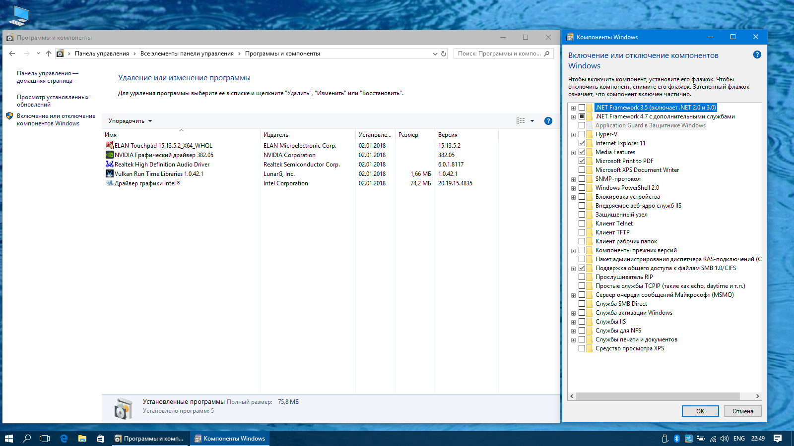 Службы принтера отключены в компонентах, включите при необходимости.