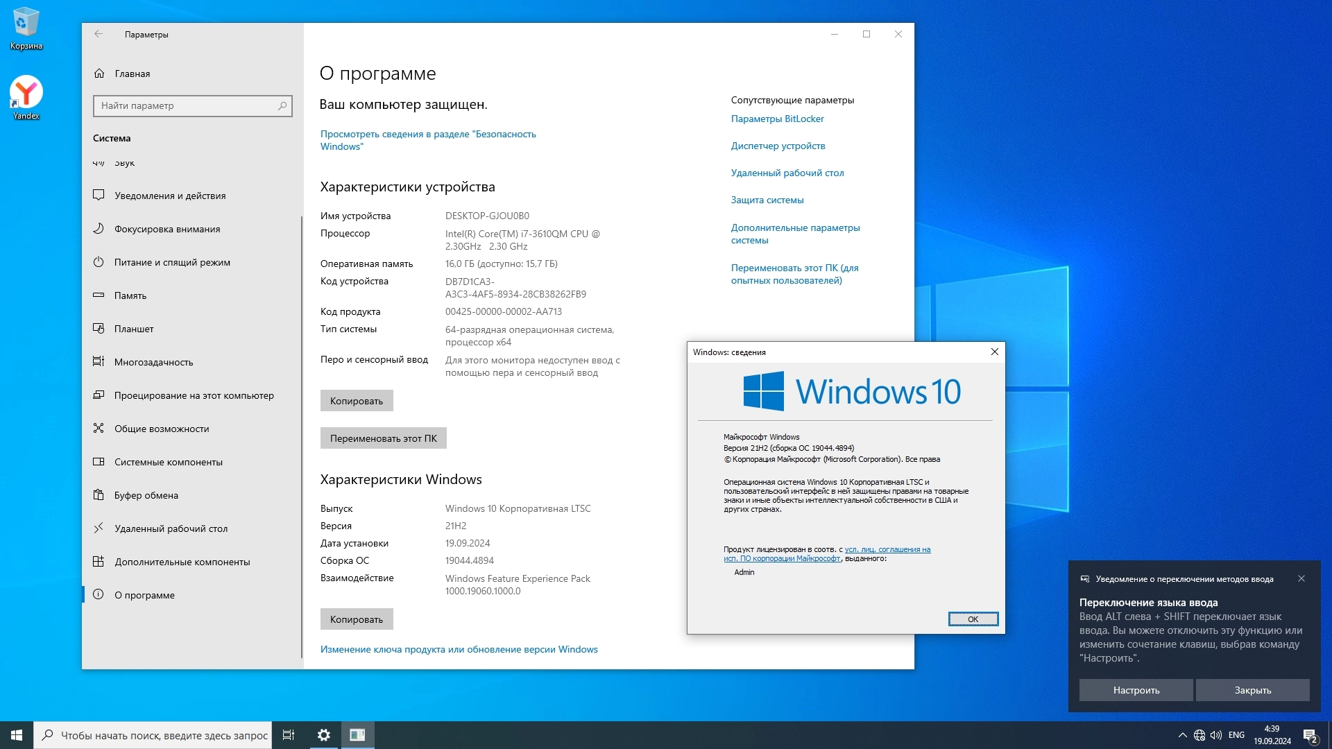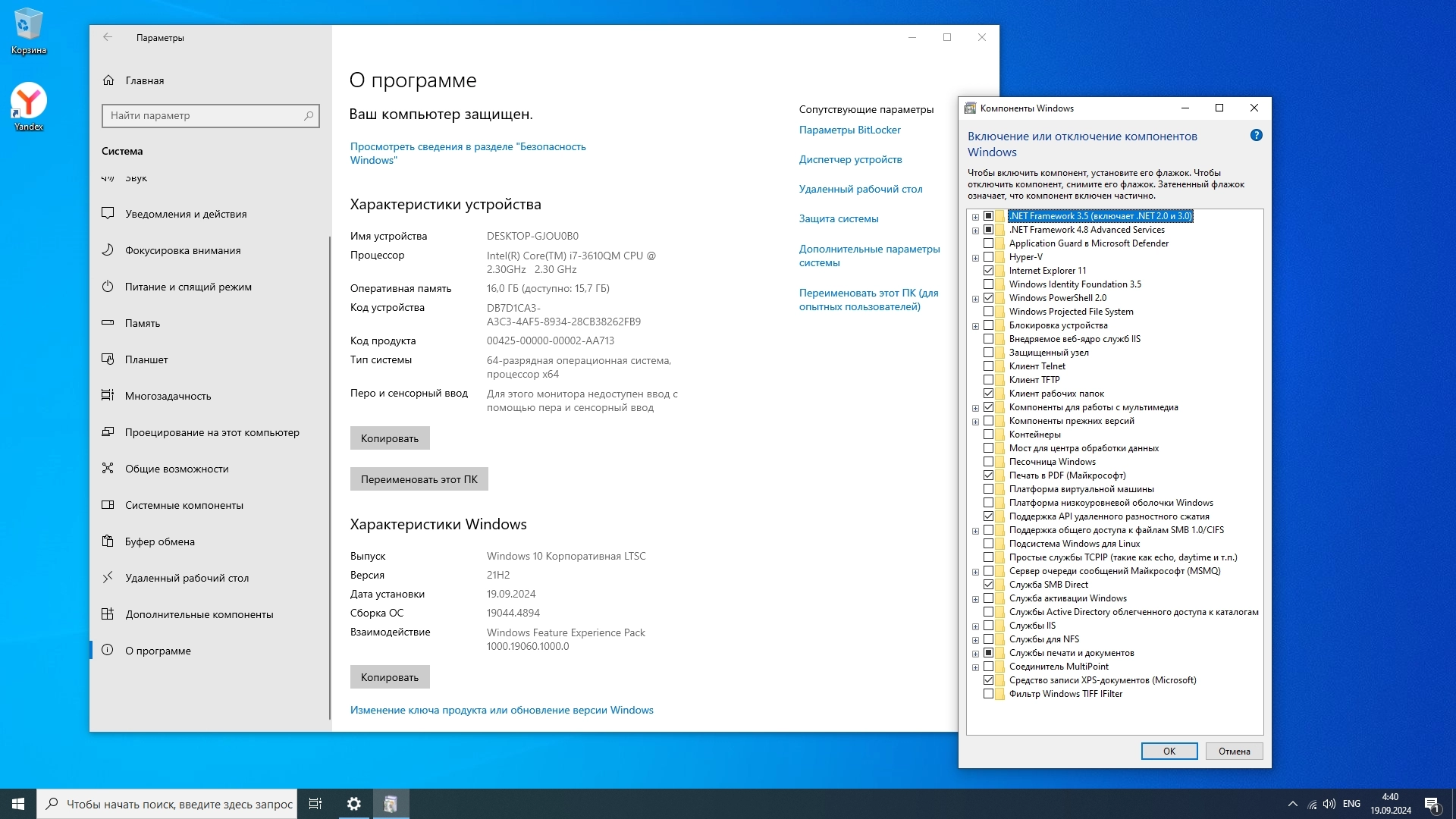 Скриншоты Windows 10 LTSC x64 Enterprise 2021 Full version Сентябрь 2024 торрент: