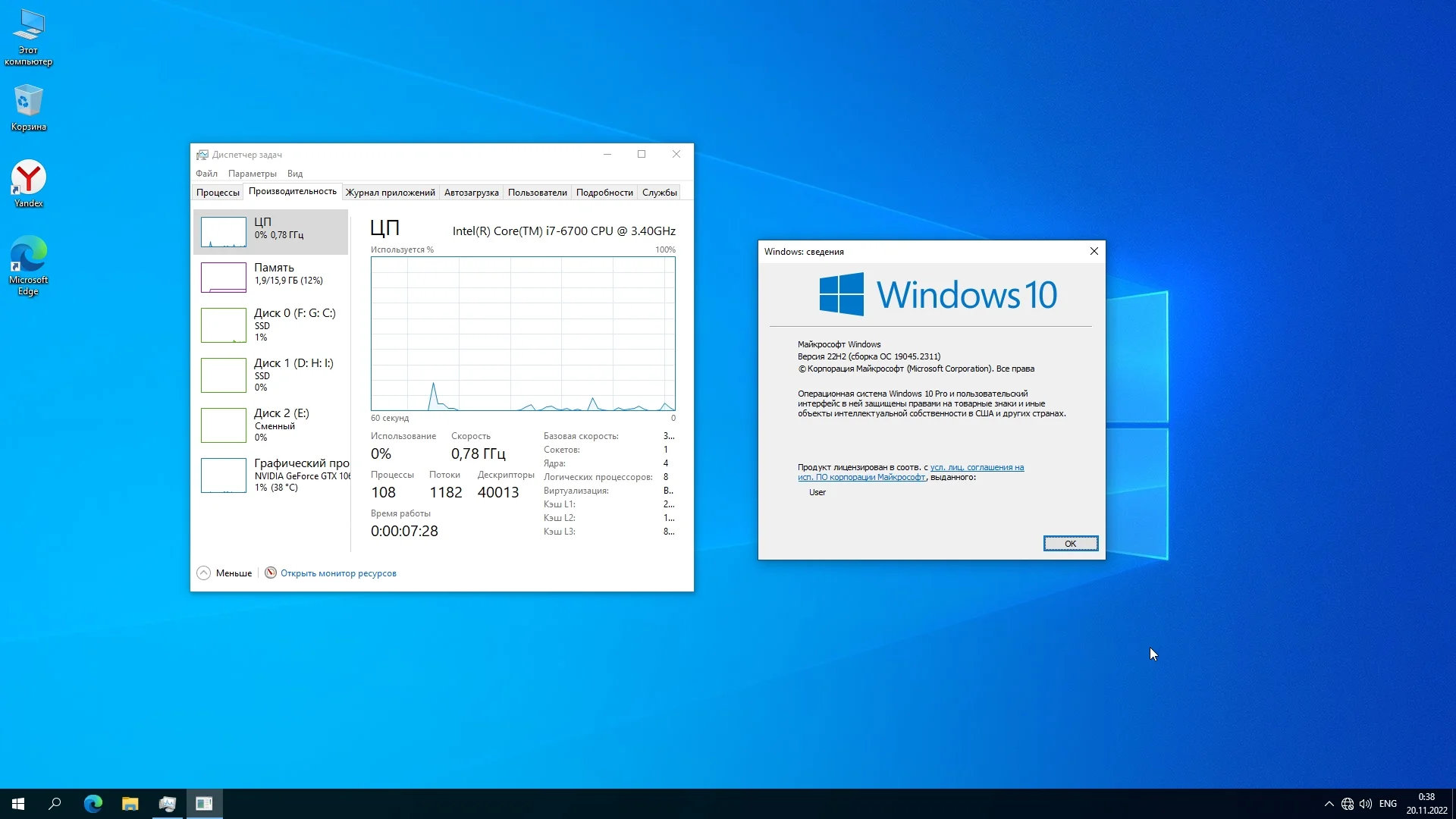 Windows 10 Pro 22H2 с обновлениями до ноябрь 2022 года, автоматической установкой и активацией. Компьютер для системы: 64-разрядный (x64) процессор с частотой 1 ГГц или быстрее или система на кристалле SoC ОЗУ: 4 ГБ.