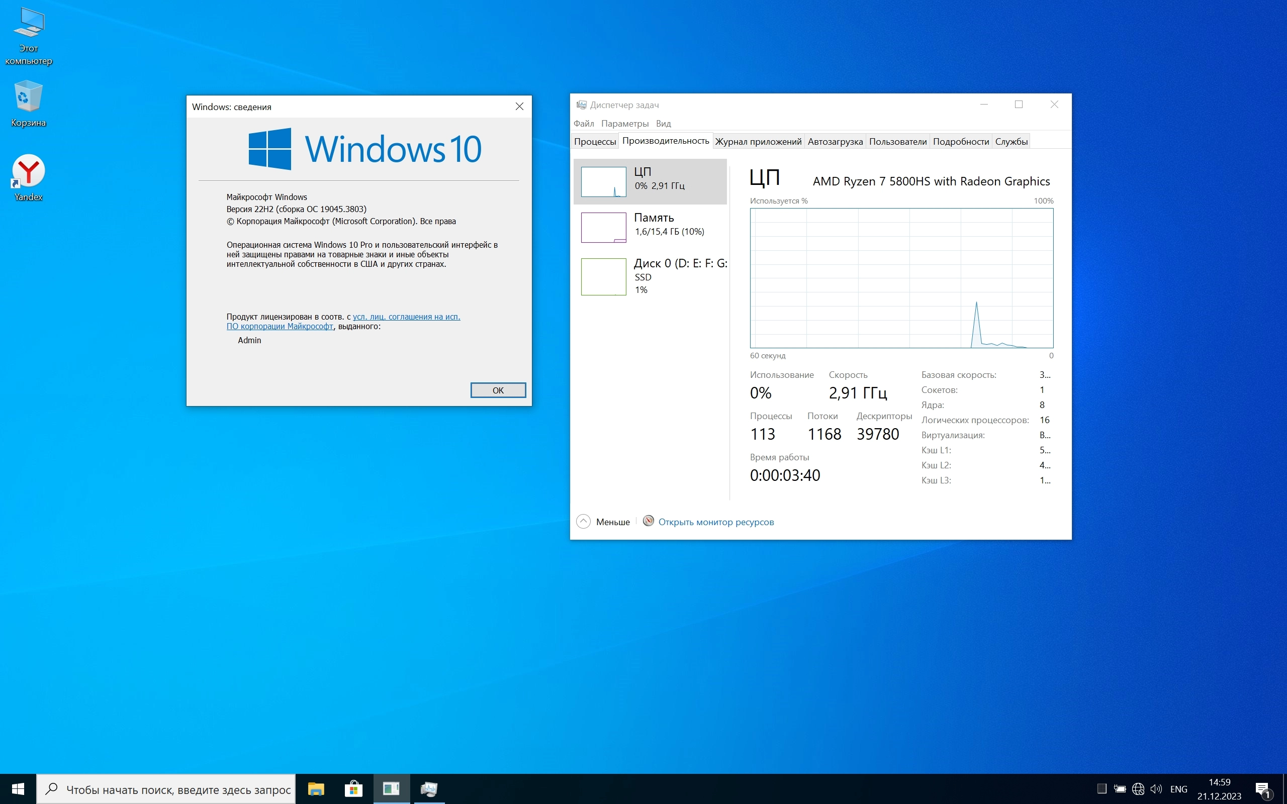 Windows 10 Pro 22H2 (19045.3803) x64 Сборка без защитника и телеметрии, минимизированные системные требования. Процессор: не менее 1 ГГц или SoC (минимум 2000 МГц для 64-разрядных систем). ОЗУ: 2 ГБ для 64-разрядных систем. Место на жестком диске: 10 ГБ