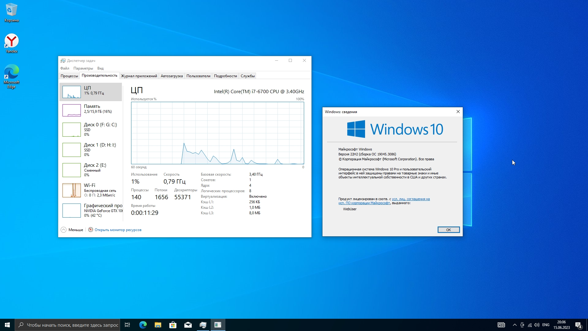 Версия Windows 10 Pro для системы, включающая обновление по 19045.3086 с июня 2023 года.