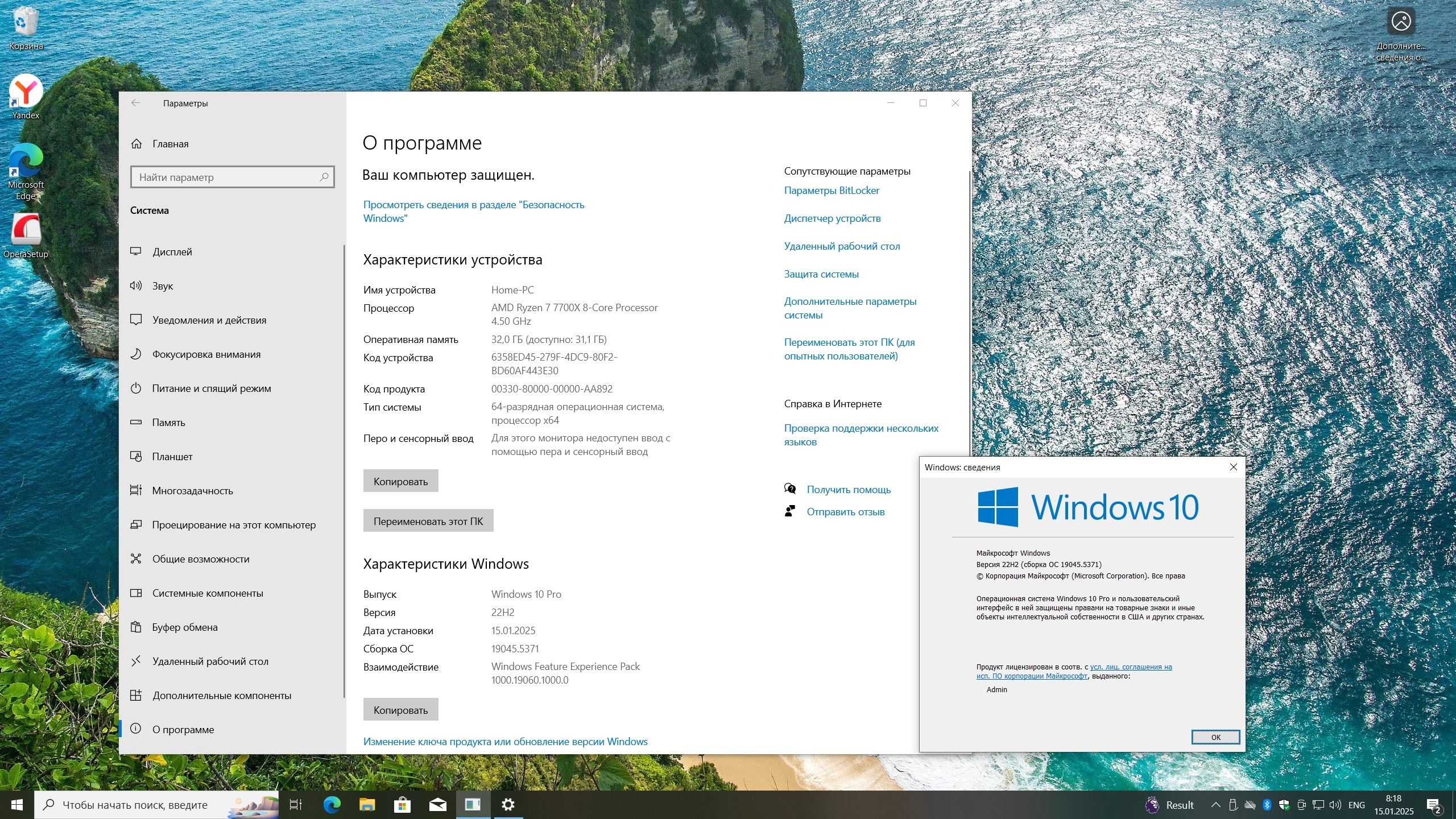 Система: ОЗУ: 4 ГБ для системы 64-разрядной системы • Место на жестком диске: 40 ГБ для 64-разрядной ОС • Процессор не менее 2 ГГц или SoC из за "Microsoft Store" • Видеоадаптер: DirectX 9/10 или более поздняя версия с драйвером WDDM 1.0 • Экран: 1280 x 720 Windows 10 Pro 22H2 Build 19045.5371