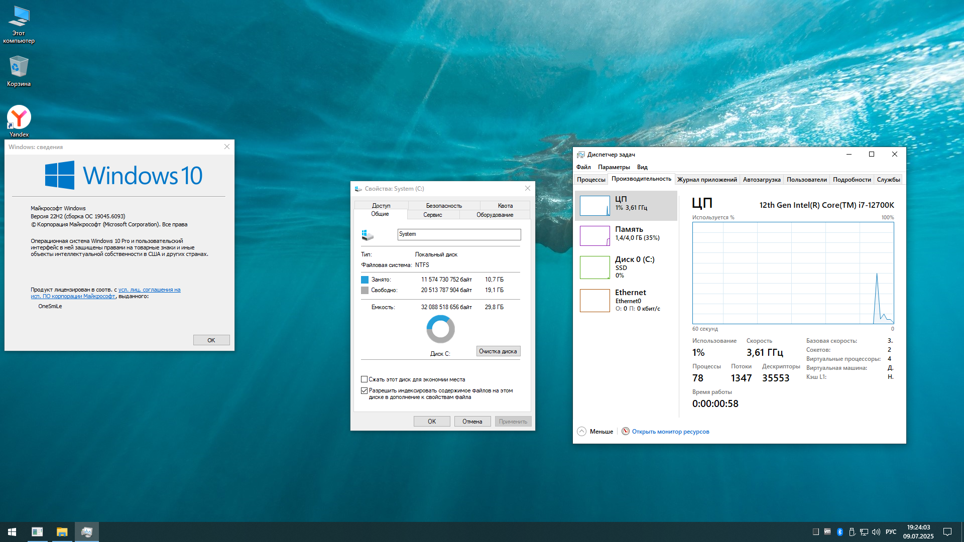 Windows 10 Pro by OneSmiLe 22H2 build 19045.6093, Версия сборки 22H2, выполненная на основе оригинальных образов, с установленными обновлениями до июля 2025 года.