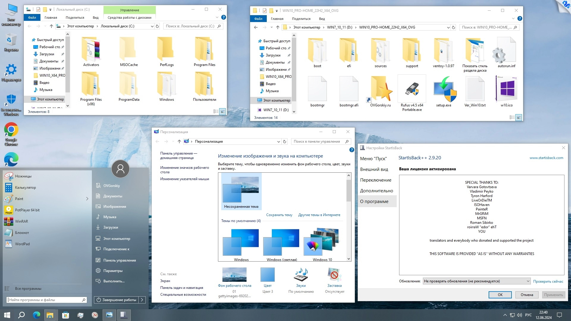 Установлено Microsoft Edge, Yandex браузер (вместо Internet Explorer), Office 2016, StartIsBack++, WinRAR, Daum PotPlayer, Visual C++ 2015-2022 Redistributable;