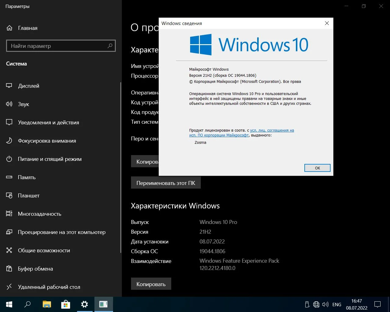 Windows 10 Pro x64 Lite 21H2 build 19044.1806 by Zosma