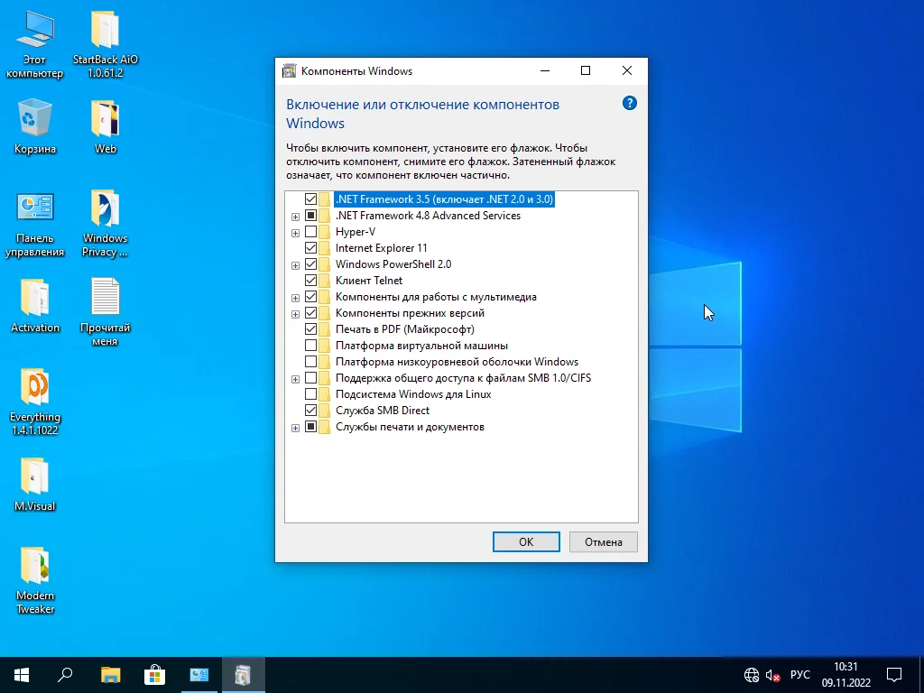 Отключена всплывающая информация о возможных проблемах с безопасностью. Включен DirectPlay, Net Framework 3.5.