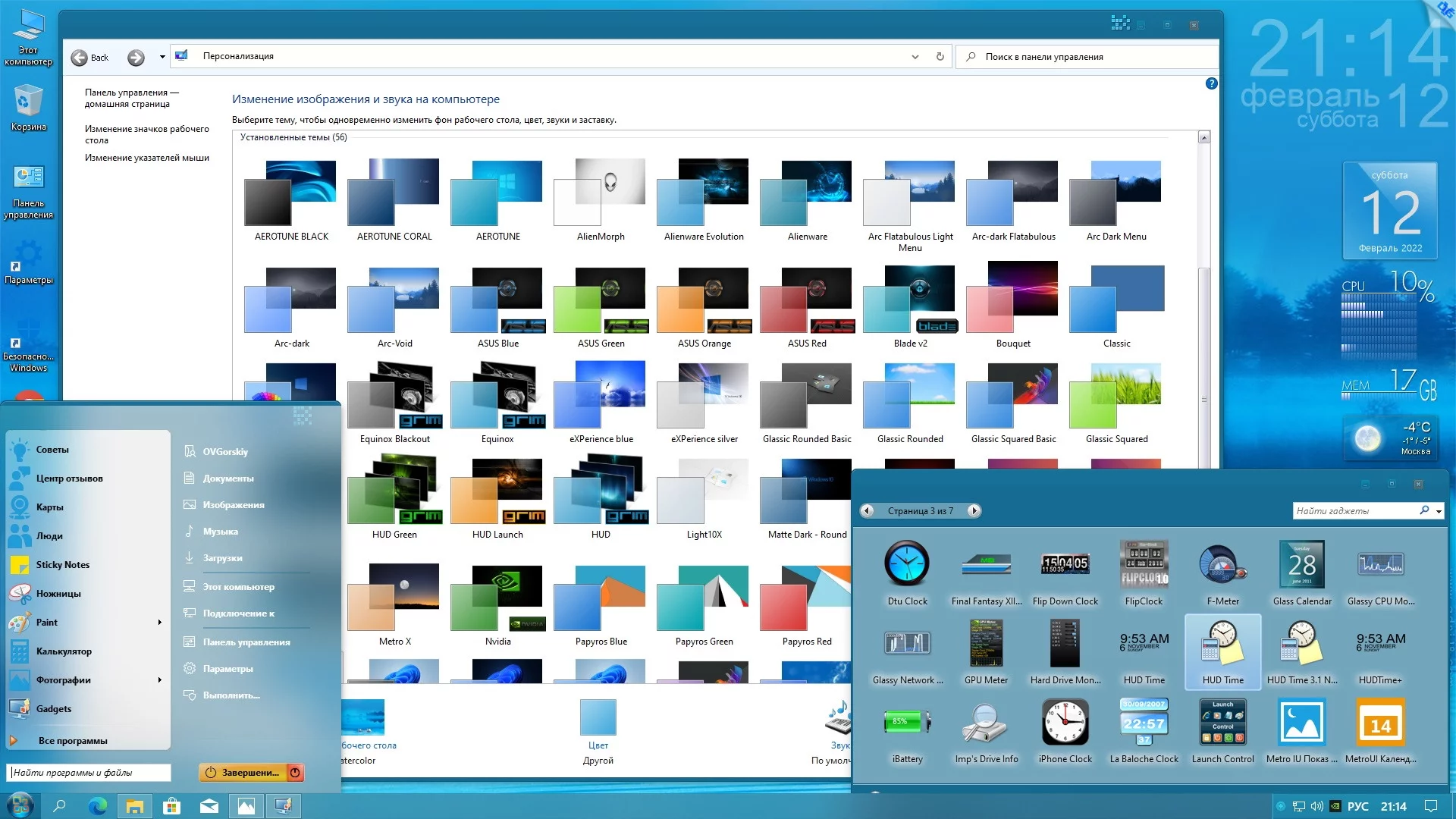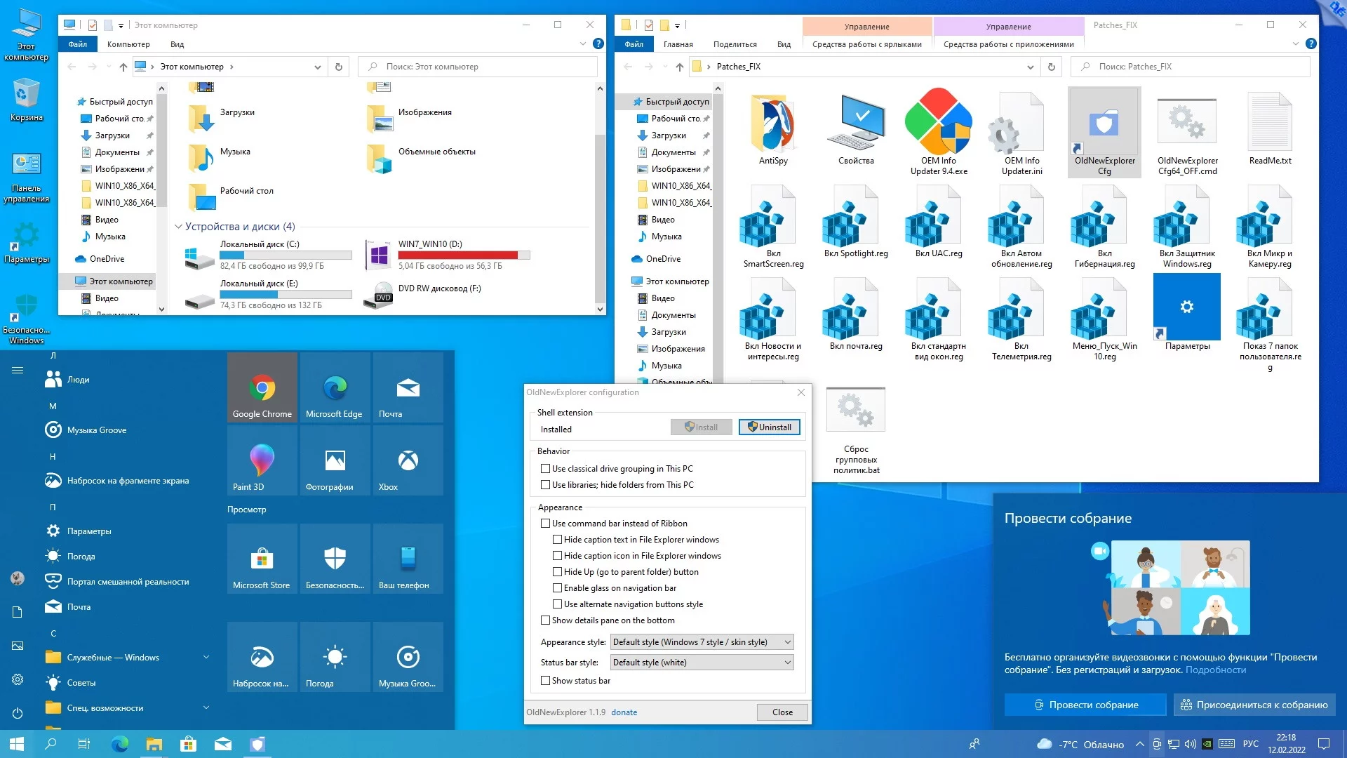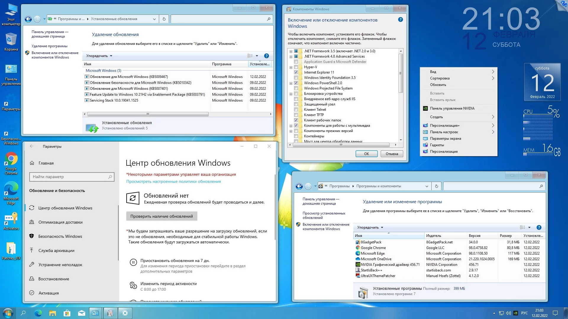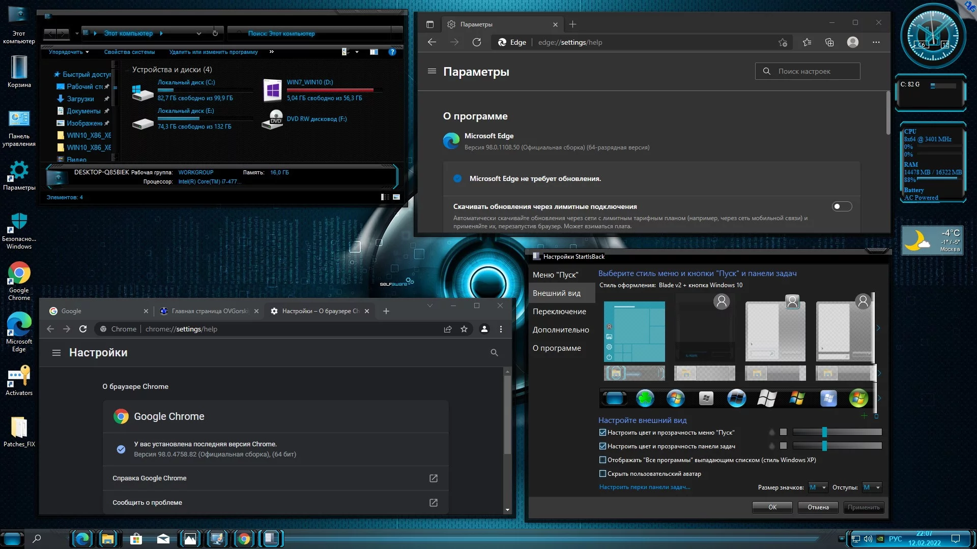- Автоматически установлены приложения: Microsoft Edge, Google Chrome, StartIsBack++, UltraUXThemePatcher, 8GadgetPack