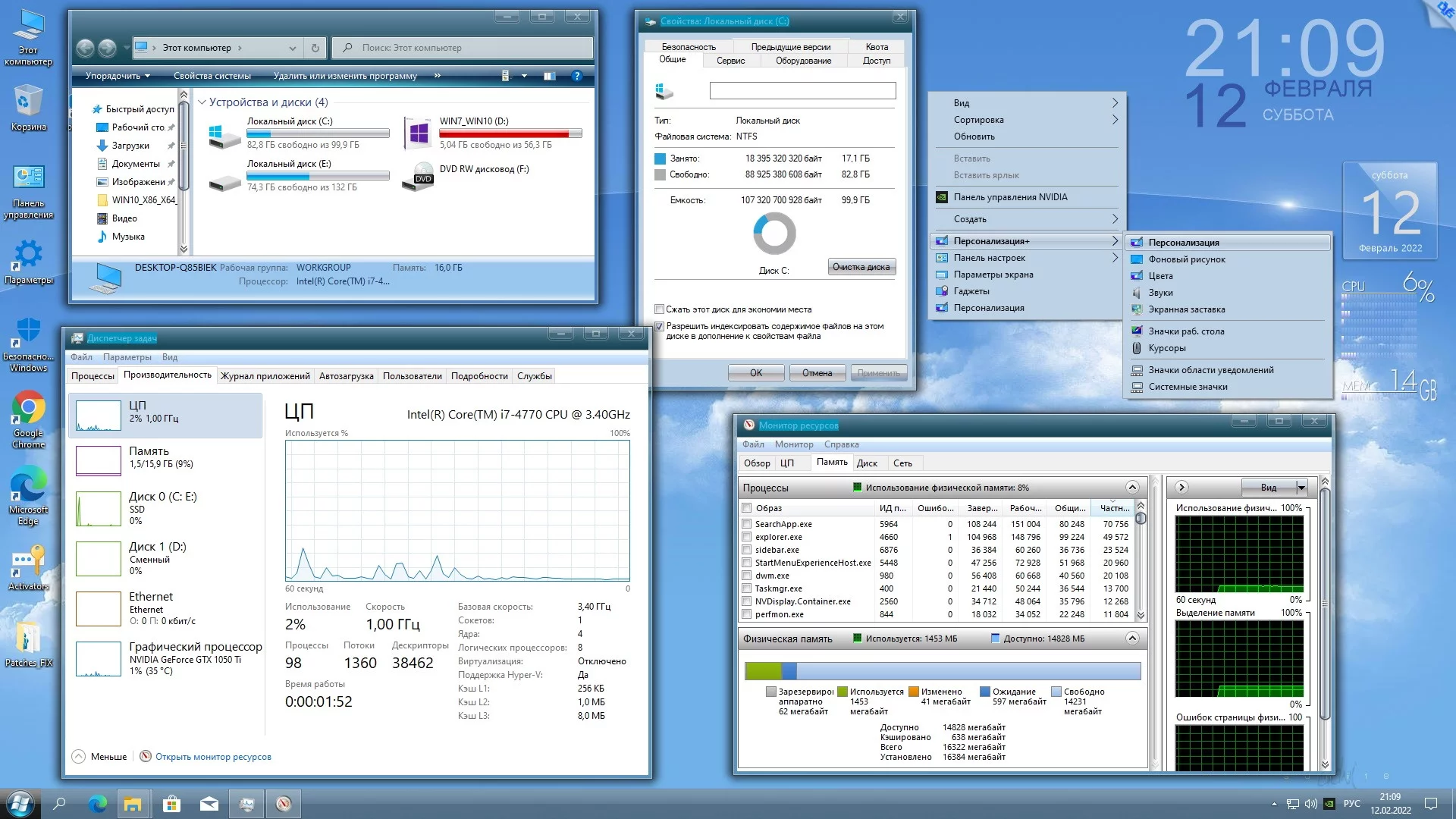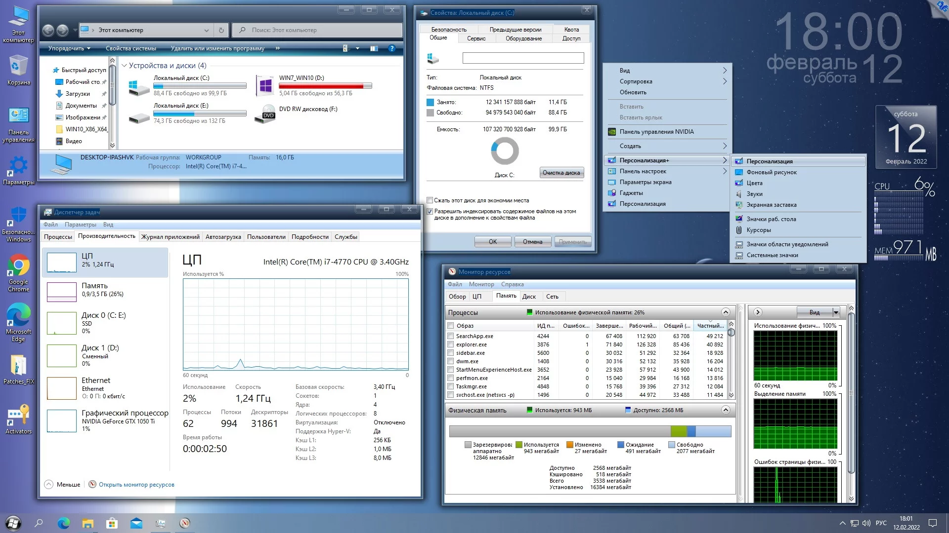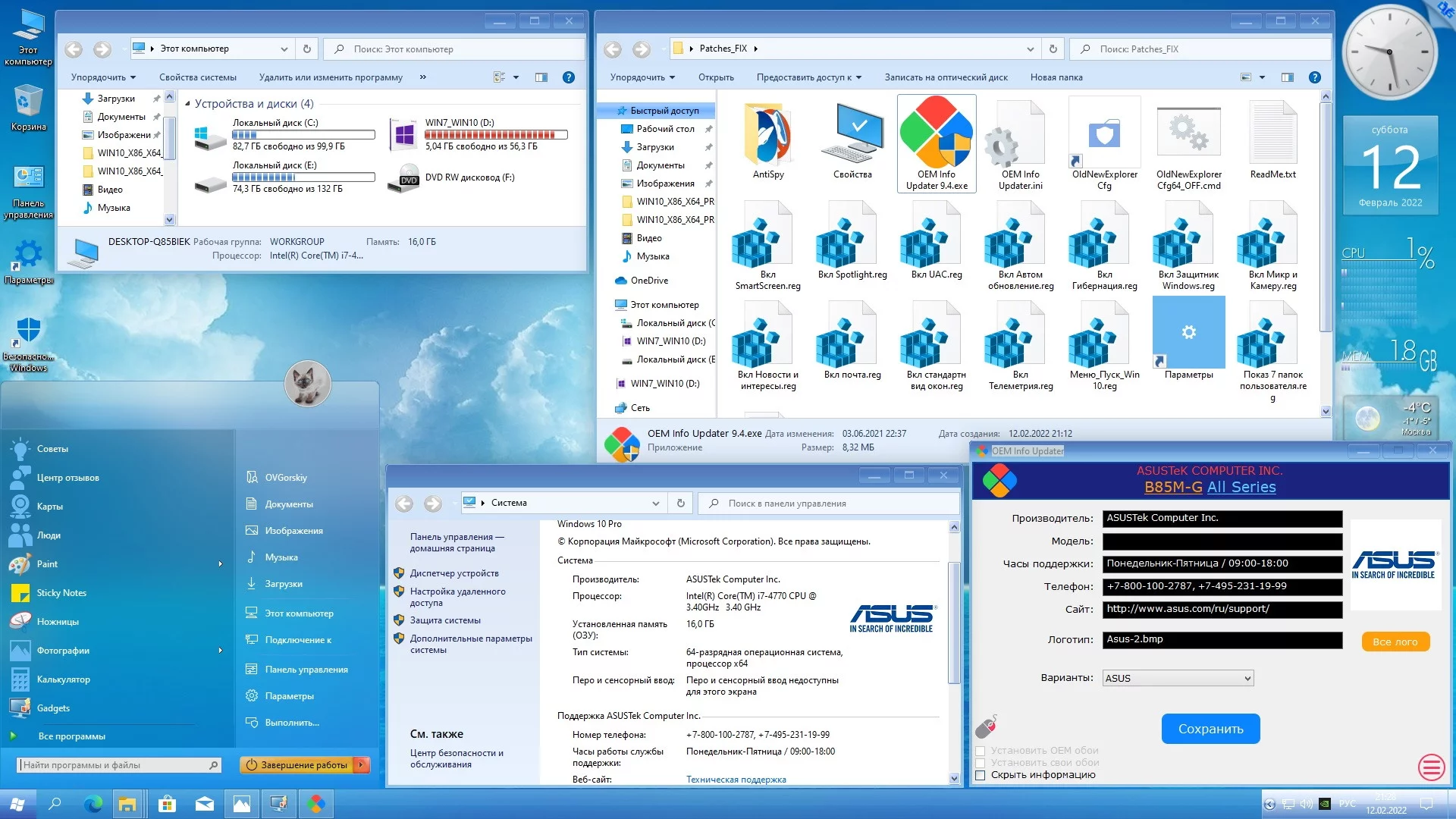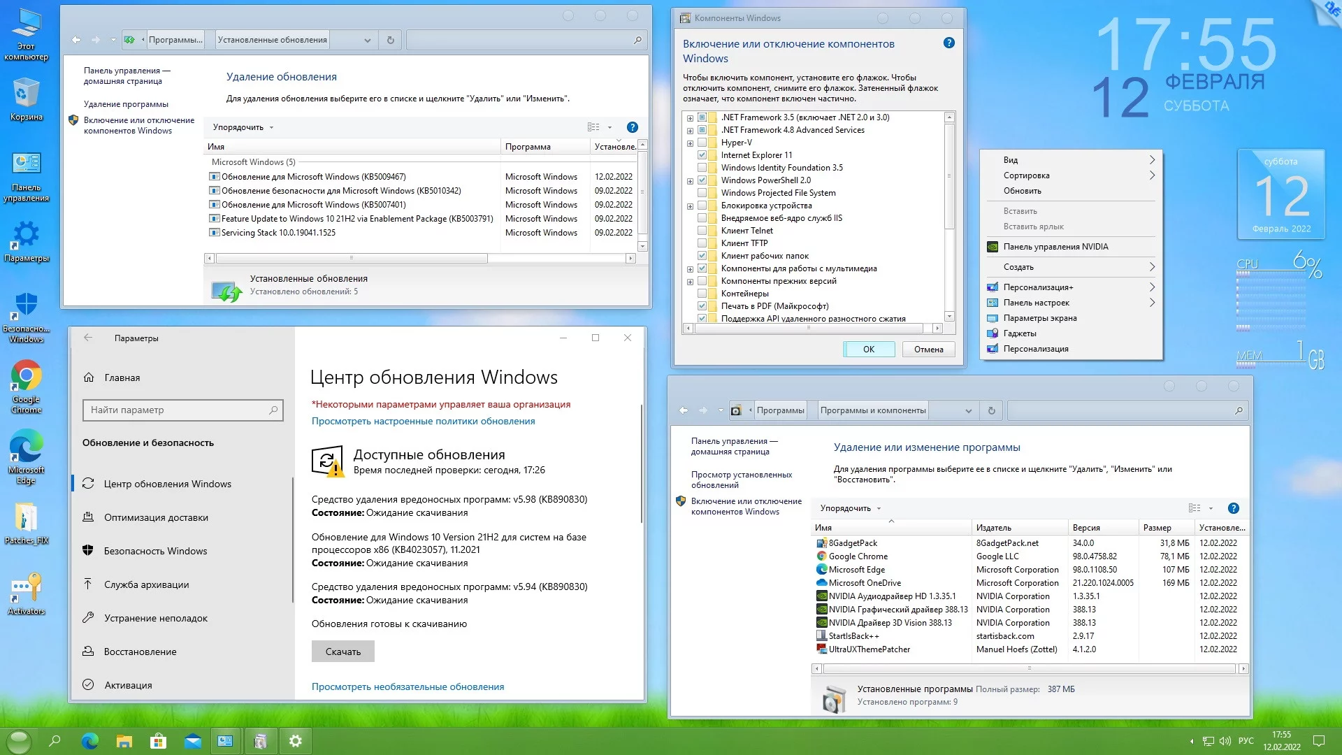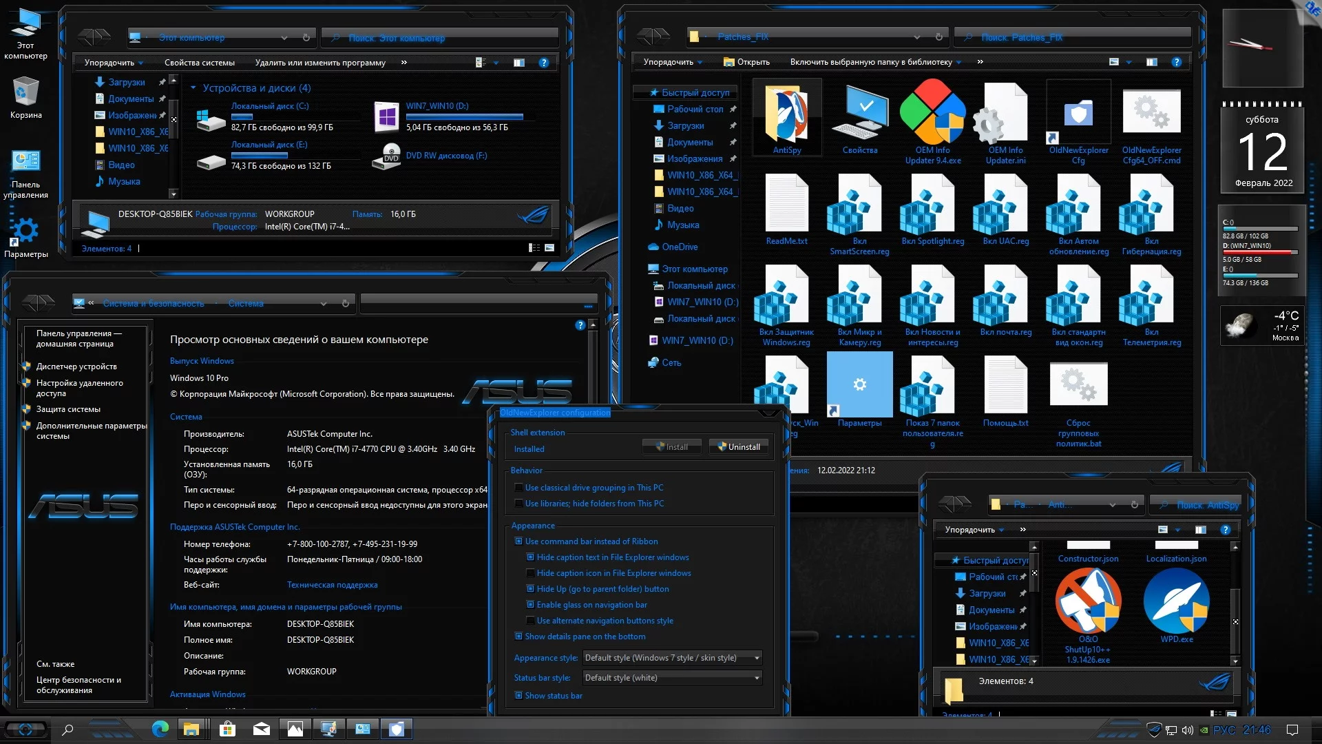 - Автоматически установлены приложения: Microsoft Edge, Google Chrome, StartIsBack++, UltraUXThemePatcher, 8GadgetPack
