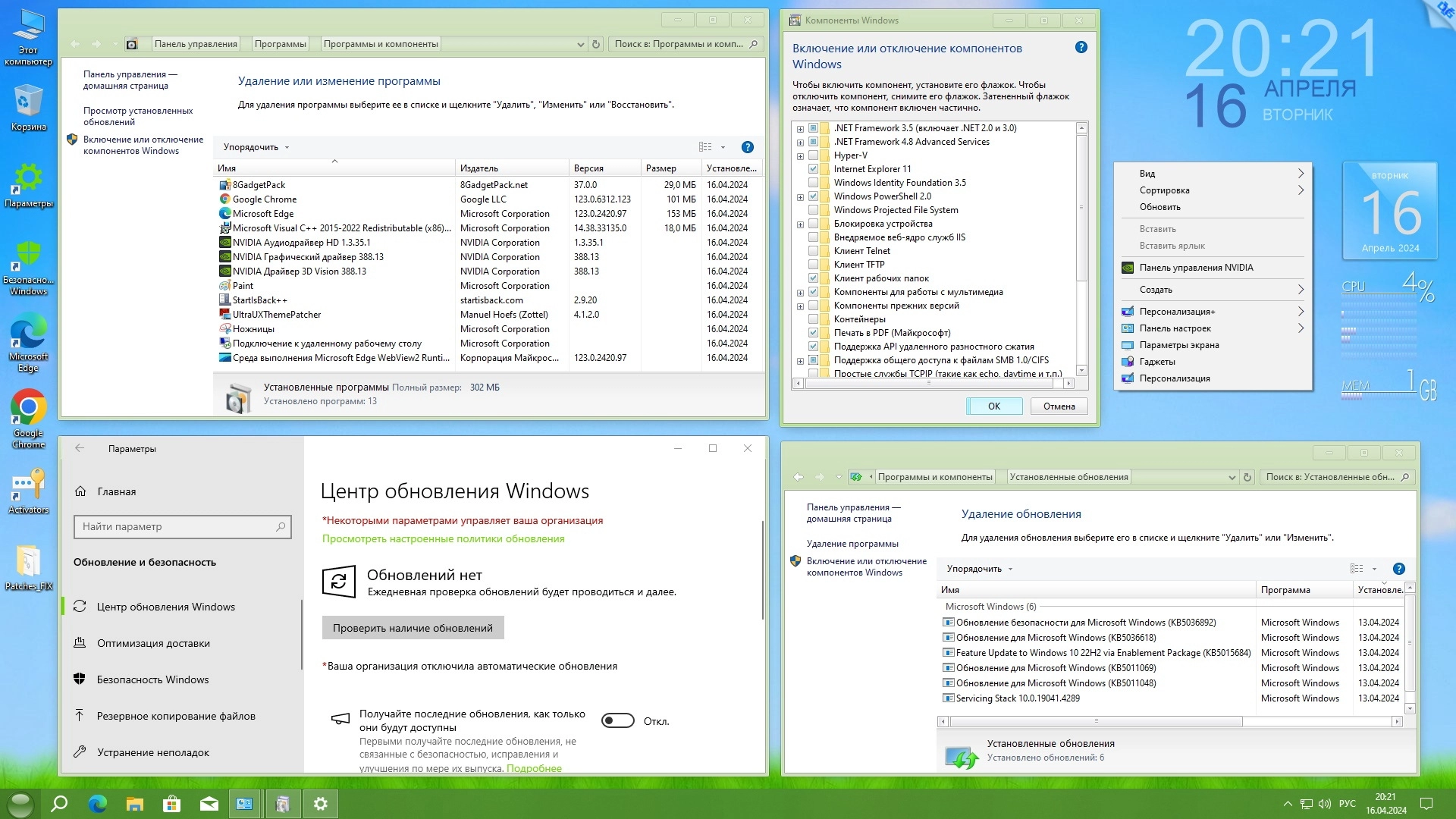 Автоматически устанавливаемые приложения: Microsoft Edge 123.0.2420.97, Yandex браузер, StartIsBack++, 8GadgetPack v37.0