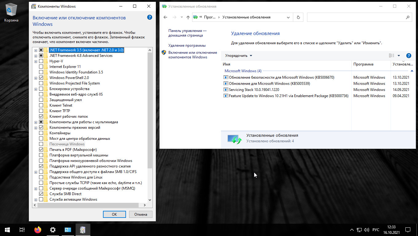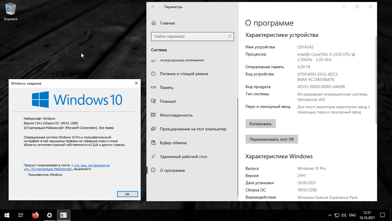 Ver: 21H1_19043.1288 / v.4.3.6 Windows 10 Professional x64 is a modification of Microsoft Windows 10 Pro 21H1 x64 that incorporates feedback from experts and user preferences. Upgrades are to the October 2021 release, version 19043.1288. System components and necessary programs have been integrated based on the author's opinion. You can enter a live mode to preview before installation. Computer for system: • Processor with a clock speed of at least 1.5 GHz and above • Recommended amount of RAM — more than 2 GB • 25 GB free space required on disk • DVD drive, memory card reader (Microsoft) or compatible device with an indication required • Monitor resolution higher than 800/600 • Video card — 128 MB Windows 10 Professional x64 v.4.3.6 by c400''s torrent, differences from the original: 1. Ease of installation: • Installed via flash drive • Installation time is less than 15 minutes • The system contains all necessary software for operation • All programs are pre-configured and not overly extensive • Bootable flash drive includes a number of useful utilities 2. Speed: • Optimized for maximum performance without loss in compatibility or functionality • System components have been tuned to maximize memory, network stack, disk subsystems (including SSD or HDD types), as well as NET assemblies • Lastest system libraries are used and all updates to critical issues have been provided • Only stable versions of packages and software are utilized • Antivirus software with up-to-date database included in the installation • System for detecting intrusions integrated into antivirus 3. Stability: • The system is updated and contains all latest critical updates available • Only stable versions of software packages and applications are used • No modifications in critical OS subsystems 4. Privacy: • Microsoft’s spying functions have been disabled • Blocked DNS addresses, Windows/Office spyware detection systems, and active antivirus protection on the firewall and DNS rules • Browsers integrate an anti-advertising system and block harmful content • The program does not contain any advertisements or malicious software 5. Compatibility: • OpenAL libraries integrated with Microsoft Visual C++, Microsoft
