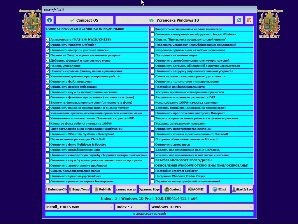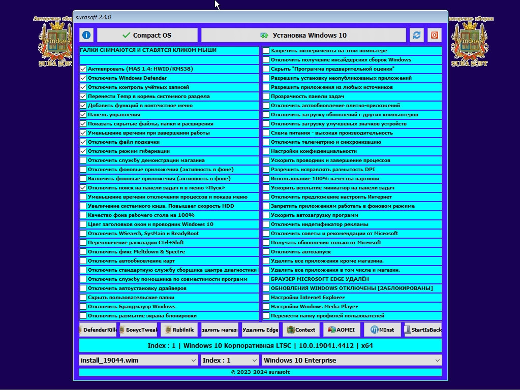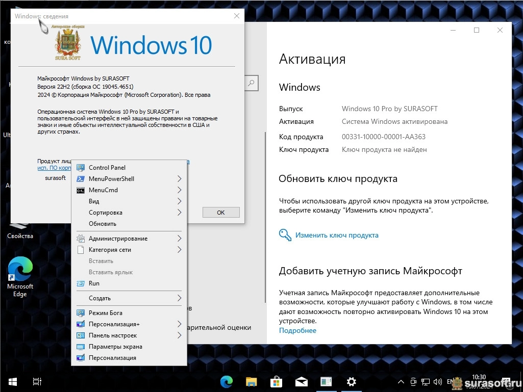 Windows 10 Русская surasoft 19044_19045.4651 мод для Windows 22H2, включает обновления по июлью 2024 года и другие улучшения: Интегрированы обновления, панель управления настройки; косметические изменения; .Net Framework 4.8.1 и дополнительные драйверы; Yandex браузер 24.6.2.787 и Games Pack для Windows. Компьютер: Процессор ≥ 1 ГГц, ОЗУ от 1 ГБ (32-бит) или 2 ГБ (64-бит); жесткий диск от 16 ГБ; 800 x 600; Интернет для обновлений и опций. Сборка с установкой снарядов, включая SmartFix и Microsoft DaRT. Панель управления, улучшенные функции.