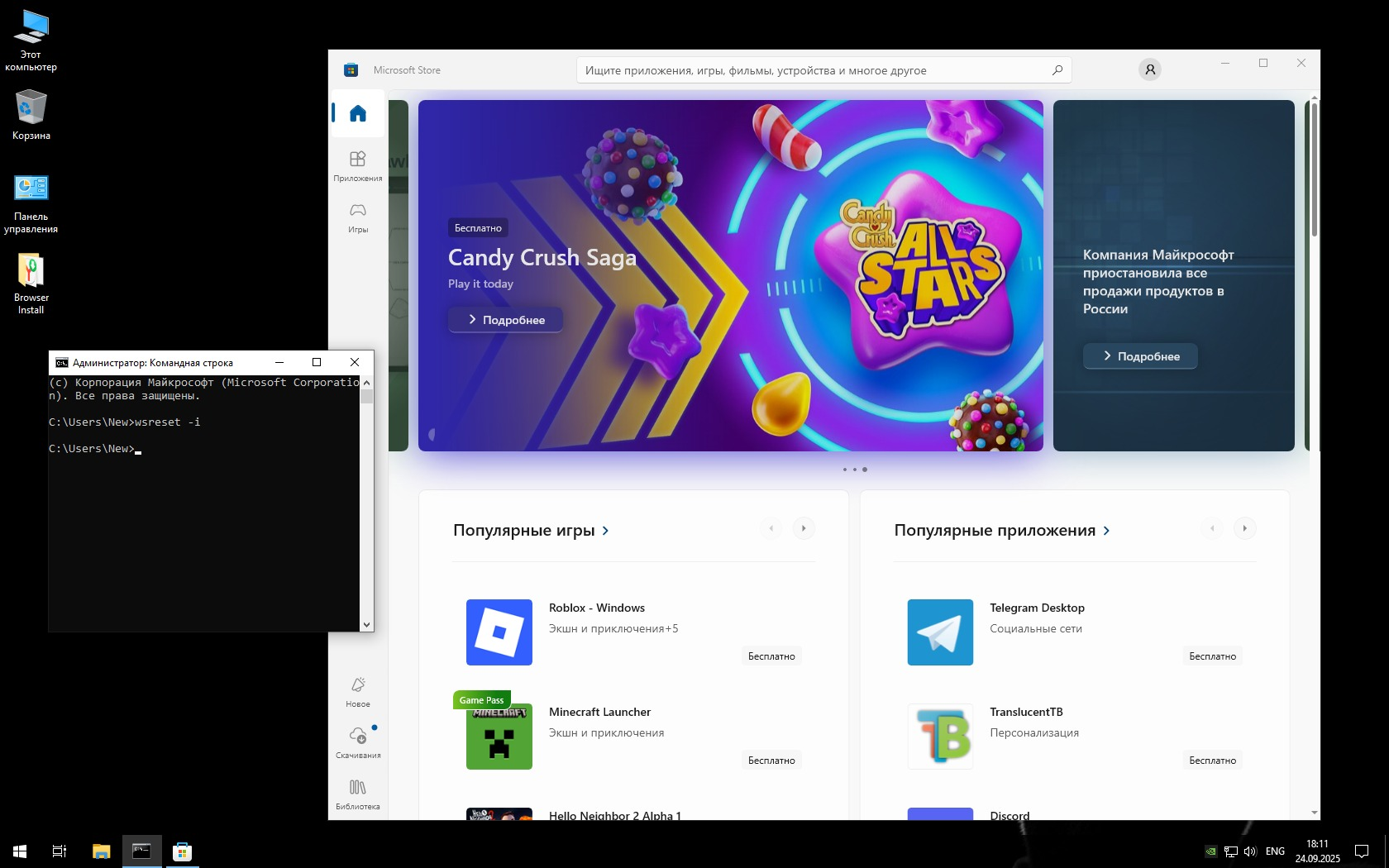- Microsoft Store можно вернуть командой wsreset -i
