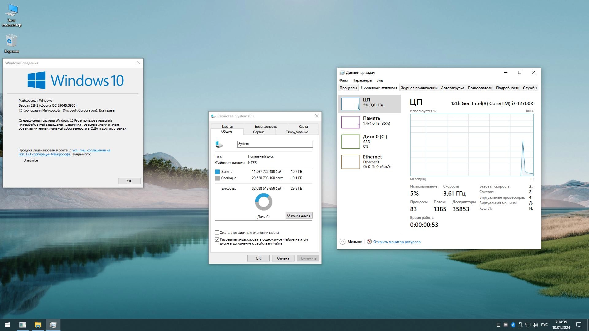 Версия 22H2 build 19045.3930 Сборка сделана из оригинальных образов с обновлениями по январь 2024. Удалены все модерн приложения. Поиск работает (значок скрыт). Компьютер для системы: • Процессор: Как минимум 1 ГГц или SoC. • ОЗУ: 2 ГБ (для 64-разрядных систем). • Место на жестком диске: 10 ГБ (для 64-разрядных систем). • Видеоадаптер: