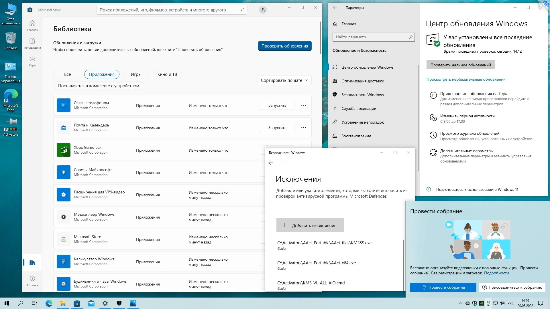 - Папка с активаторами и сами активаторы внесены в исключения Защитника Windows.
