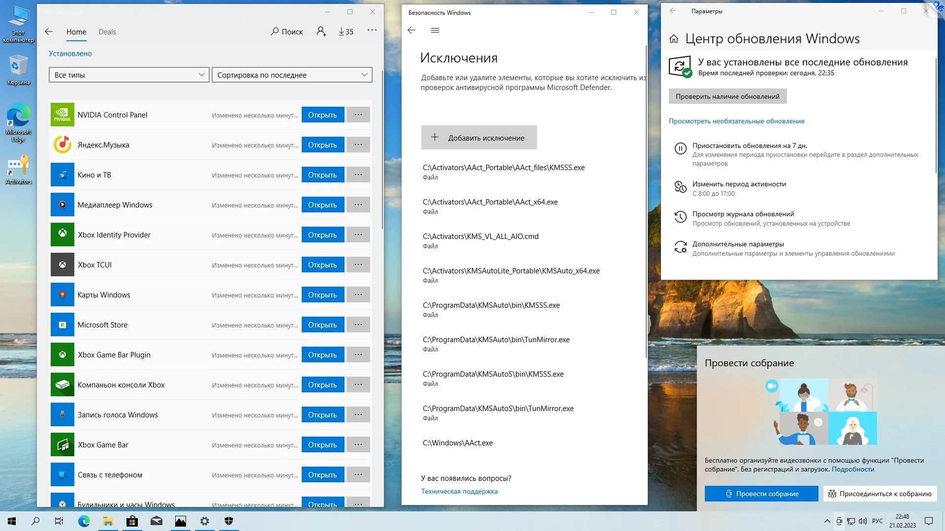 Папка с активаторами и сама активация внесены в исключения Защитника Windows.