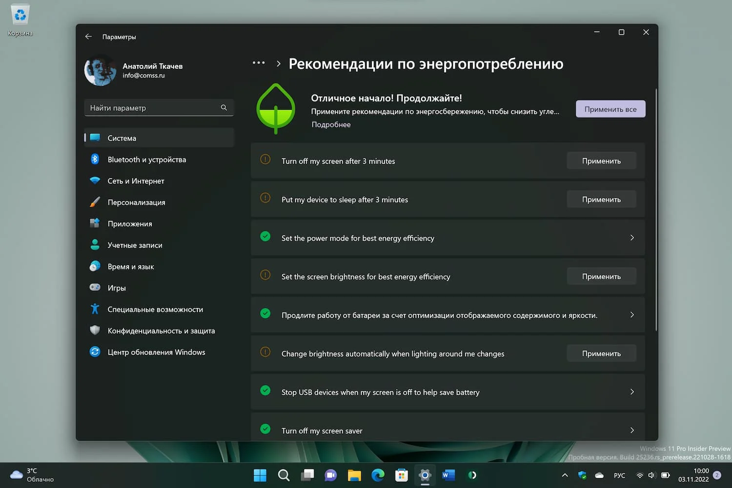 Обновленная сборка Windows 11 Pro Insider Preview, доступна на инсайдерах с 8 ноября. Компьютер для системы: