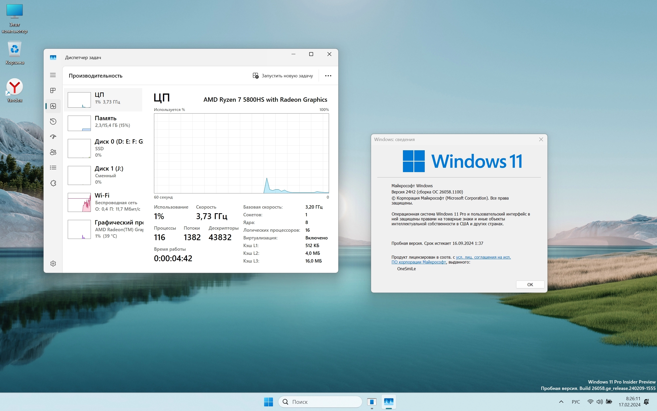 Windows 11 24H2 x64 Русская, версия 26058.1100 от OneSmiLe, предназначена для инсайдеров с обновлениями к февралю 2024 года. Системные требования: Процессор: не менее двух ядер с тактовой частотой не менее 1 гигагерца (ГГц) OЗУ: 4 гигабайта (GB), на диск