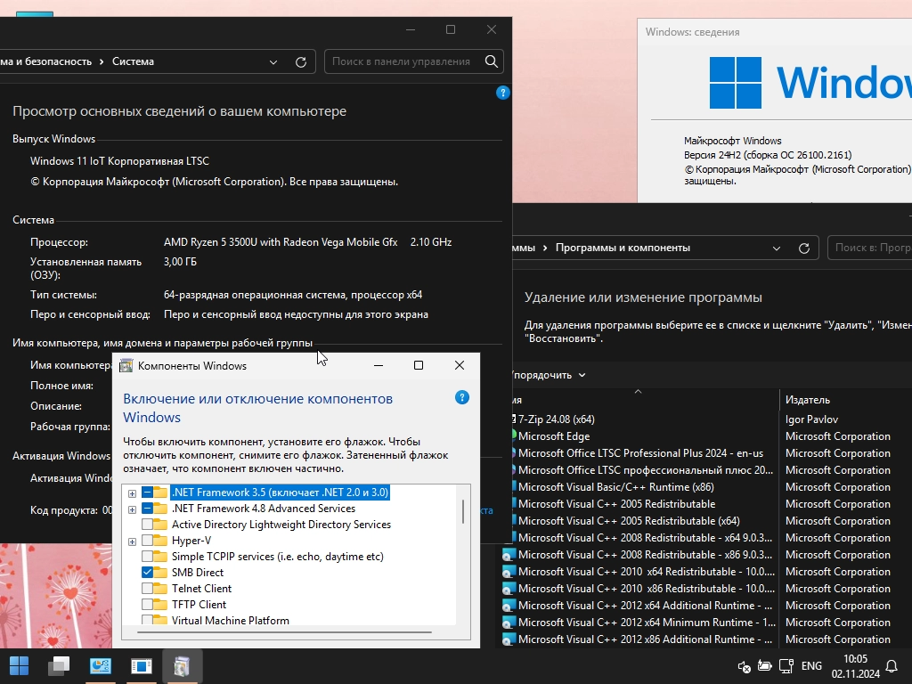 Windows 11 24in1 (+ LTSC) by SmokieBlahBlah Ноябрь 2024 Системные требования: Процессор от 1 ГГц с двумя ядрами на совместимом 64-битном процессоре или системе на кристалле (SoC) Оперативная память: 4 ГБ или более Жесткий диск: 25 ГБ свободного