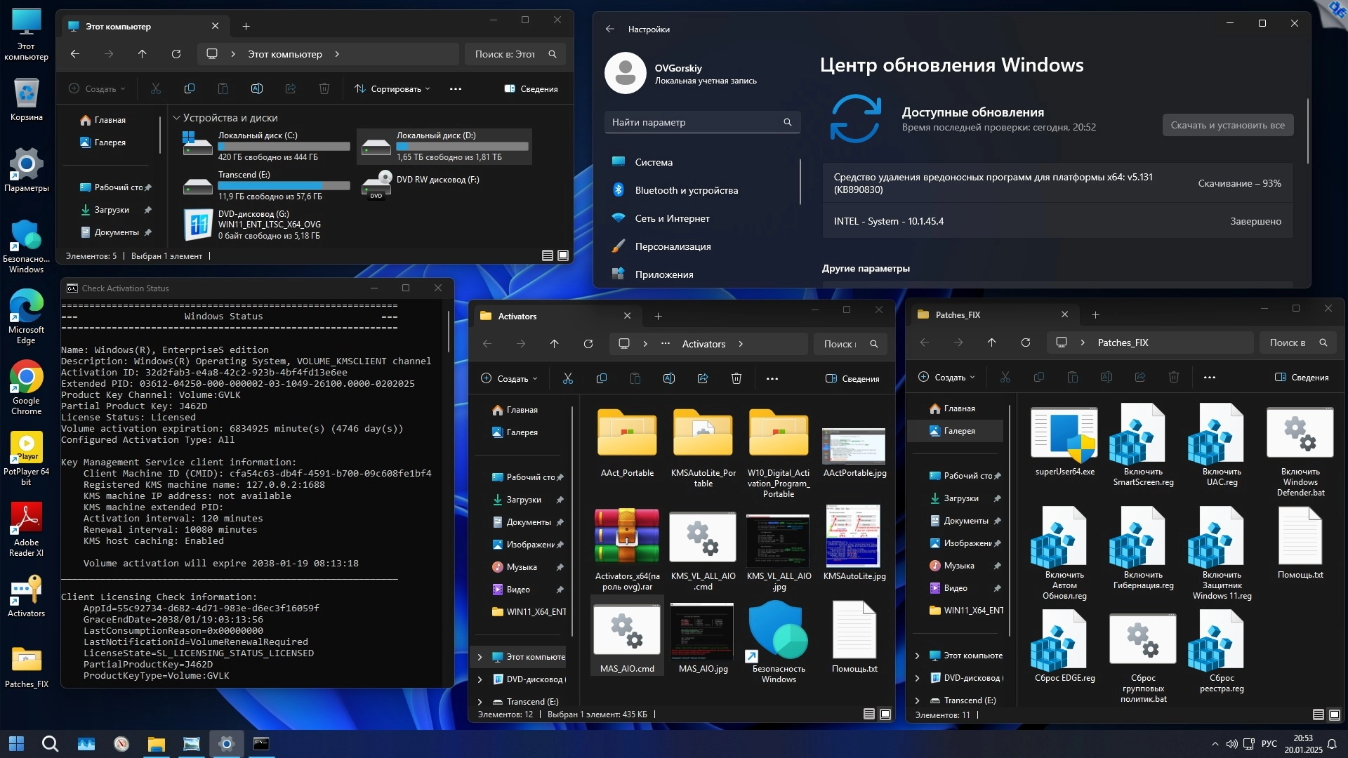 • После установки ОС на системном диске создастся папка "Activators", где вы сможете найти подборку инструментов для активации системы. Активаторы помещены в один RAR архив с парольной защитой. Отключите антивирус или защитник и извлеките активаторы из архива. Рекомендую воспользоваться автоматическим KMS активатором AAct Portable или KMSAutoLite.