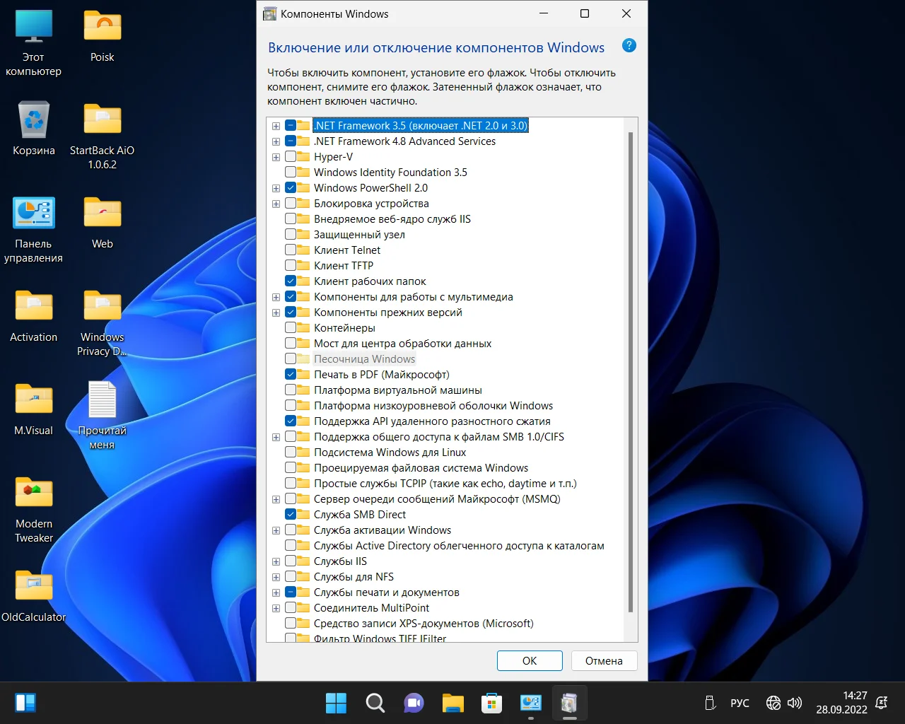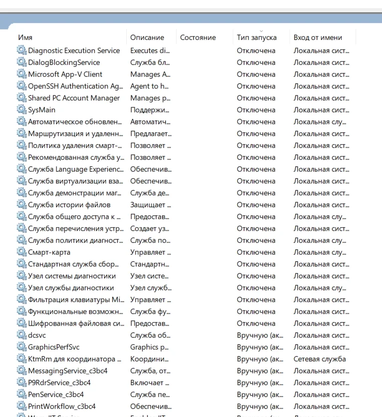 Отключены бесполезные (вредные) службы.