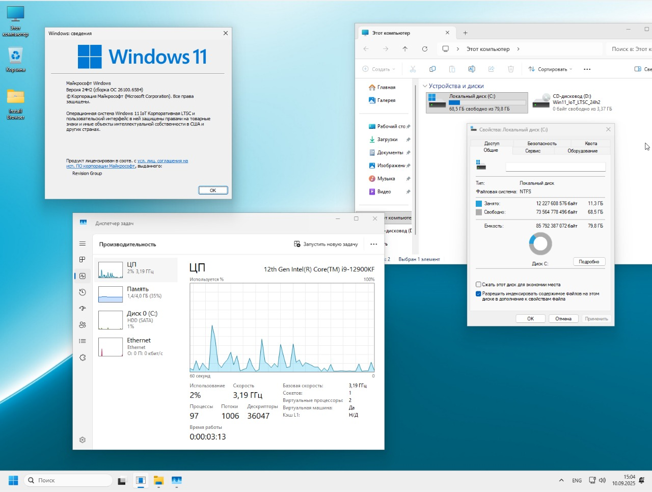 Сборка Windows 11 Lite-Game Баланс 24H2 Build 26100.6584 IoT LTSC занимает всего 11 ГБ на диске, при этом освобождает около 1.4 ГБ оперативной памяти из 4 ГБ, что делает установку более комфортным для многих систем.