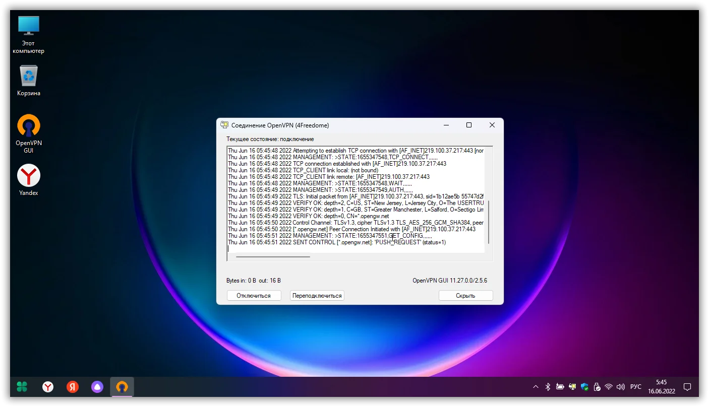 3. После запуска необходимо подключиться к OpenVPN (шлют: 83.70.214.56:443).
