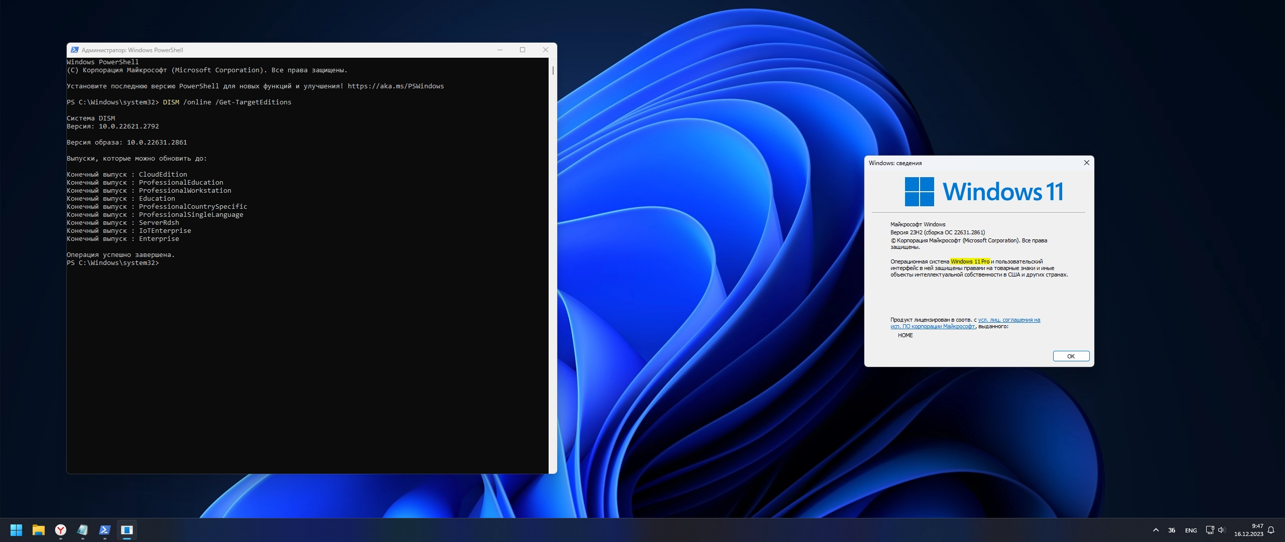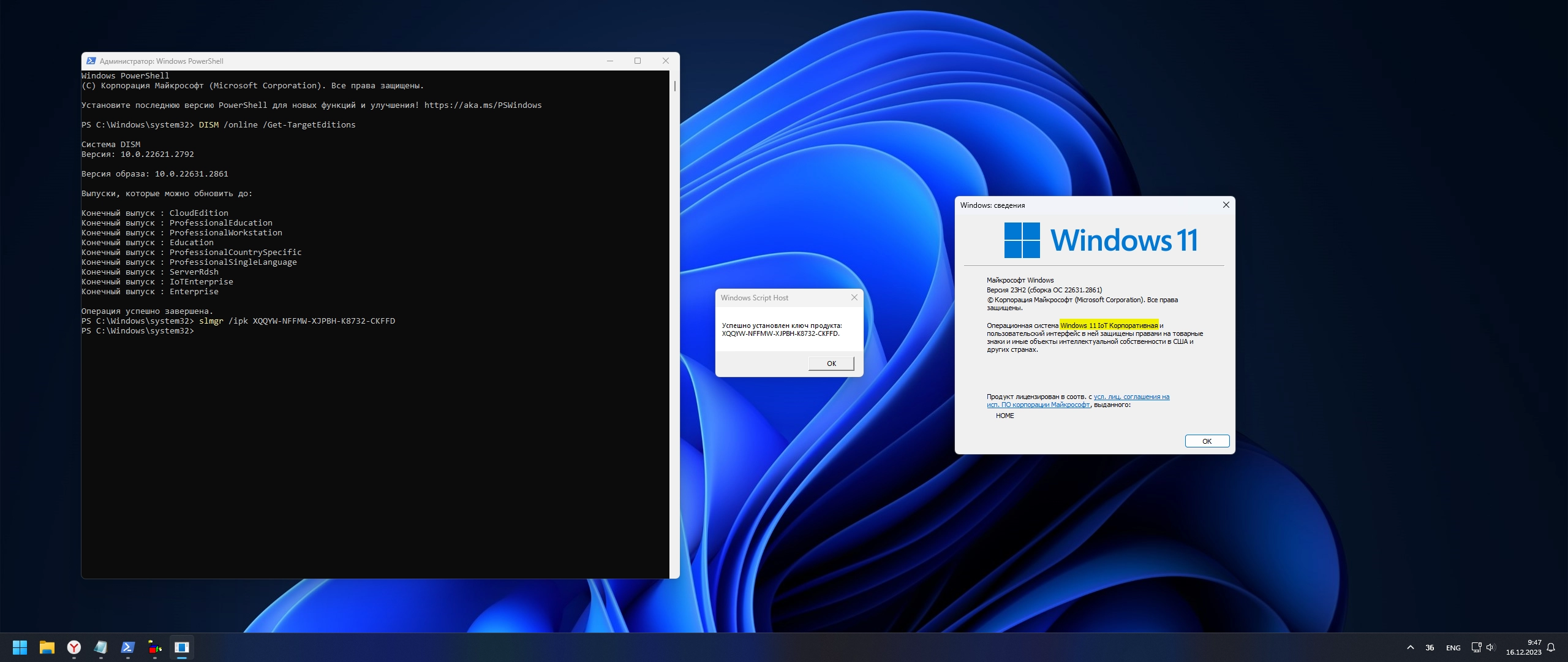 Настоящая версия Windows 11 Professional, основанная на сборке от Microsoft MSDN для Consumers Edition Version 23H2 (сдано в декабре 2023 года): • При установке быстро. Не требует дополнительных действий. • Проверки DISM / SFC проходят. • Включены: • Internet Explorer • Paint • Classical Calculator • Scissors and Viewer PhotoViewer • Драйвера для видеокарт от WDDM 2.0 и выше, включая RTX 3060 или выше • Ограничения: Процессор более 4 ГБ RAM; место на жестком диске 64 ГБ; • Экран 1280 x 720 и более высокого разрешения (включая версии Windows)