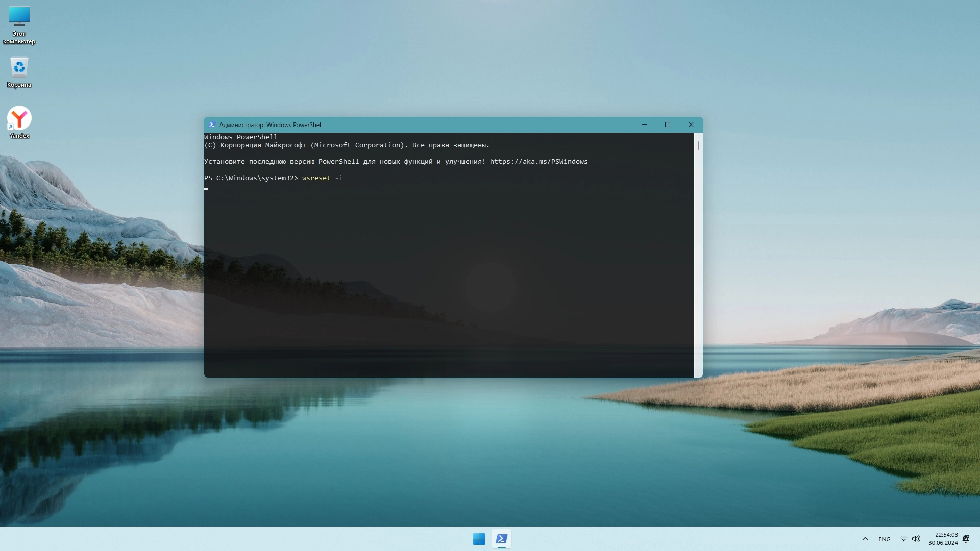 - Начните установку через PowerShell от имени администратора, вводя команду "wsreset -i"