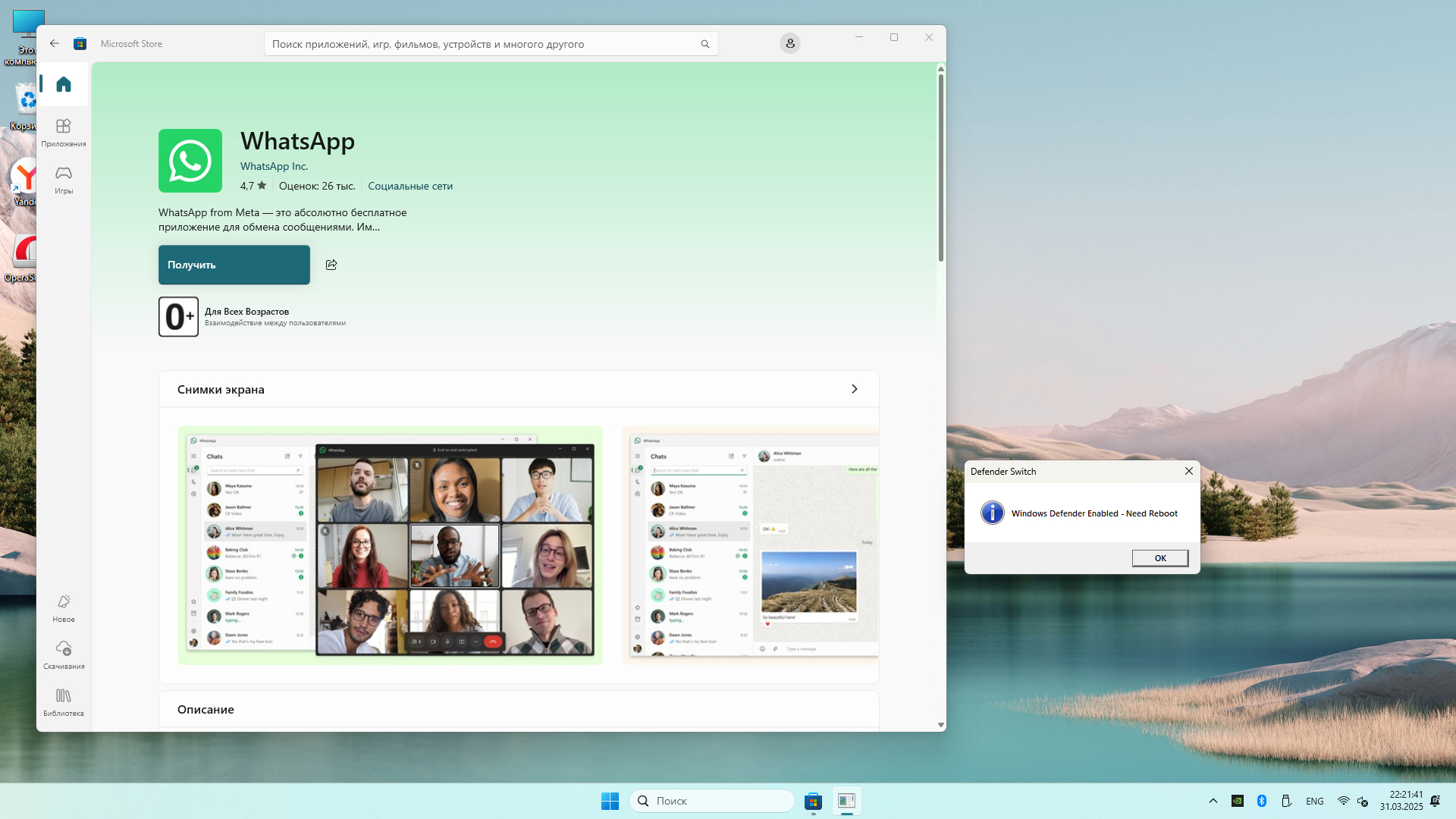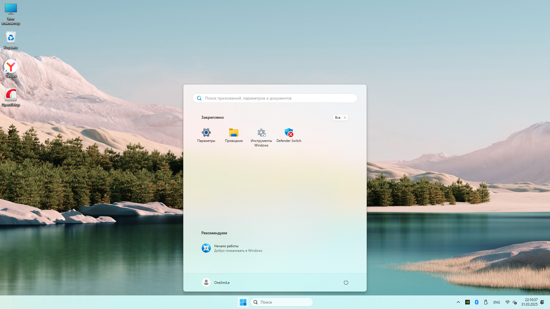 Сборка на основе инсайдерского образа Windows 11 24H2, с обновлениями на конец марта 2025 года. Полностью вырезаны плиточный хлам и телеметрия. Защитник Windows по умолчанию выключен, можно включить с помощью ярлыка в меню пуск (результат после перезагрузки).