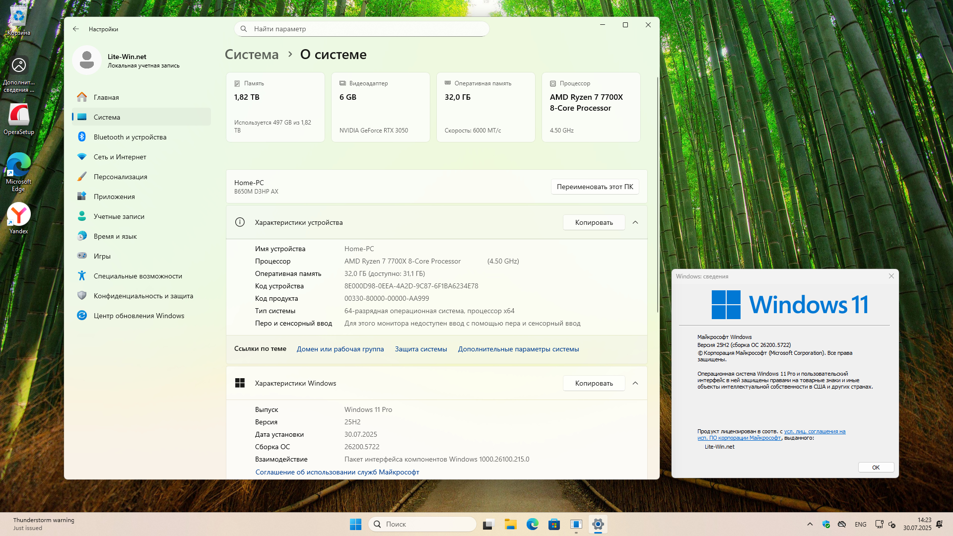Системная описываемая версия Windows 11 Pro 25H2 с обновлением до Build 26200.5722. Это новая версия, которая включает все обновления до 28 июля 2025 года.