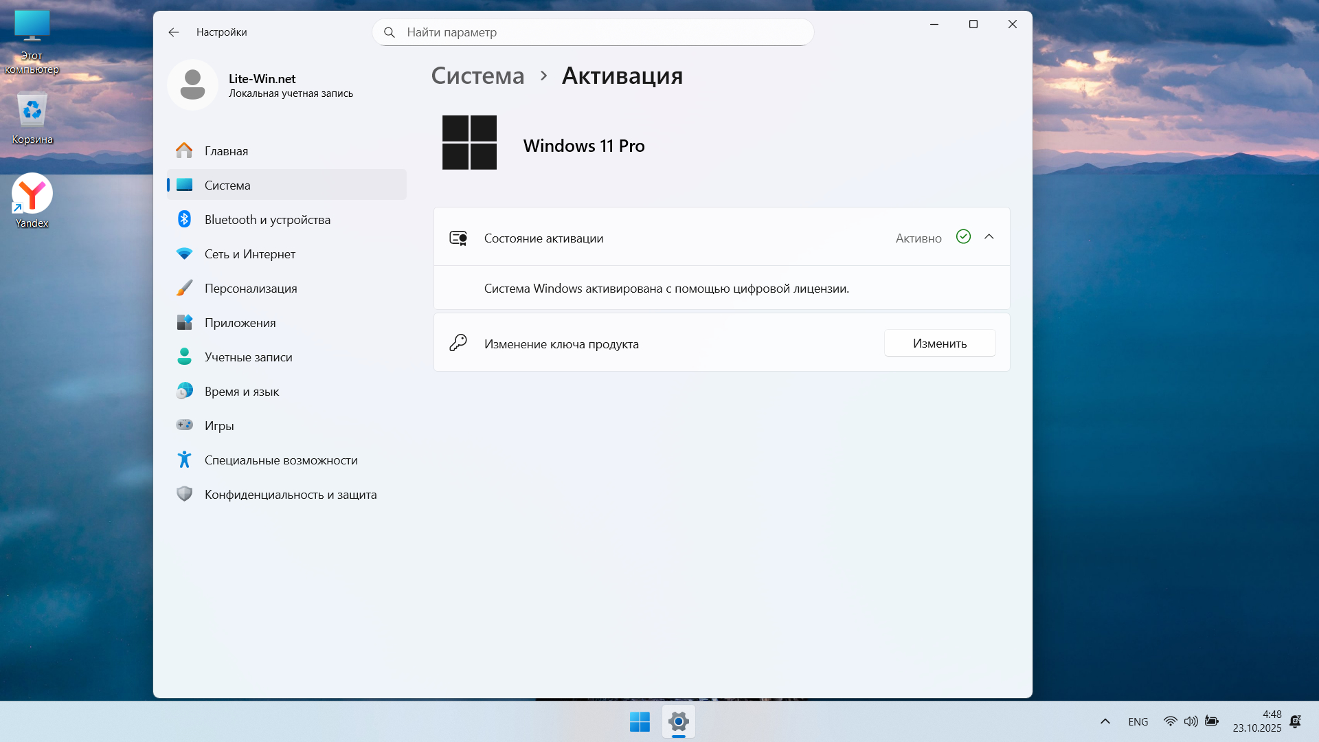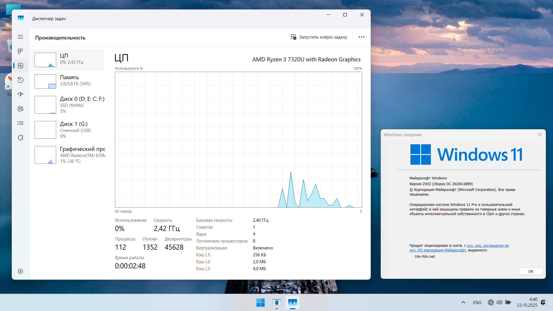 Версия Windows 11 Pro 25H2 build 26200.6899, актуальная и проста для использования. Компьютер с процессором не менее двух ядер на 4 гБ ОЗУ с двумя дисками. Системные требования: видеоадаптер DirectX 12 или более поздняя версия; экран 720p с диагональю более 9 дюймов, 8 бит на цветовой канал; SecureBoot и TPM 2.0 не требуется.