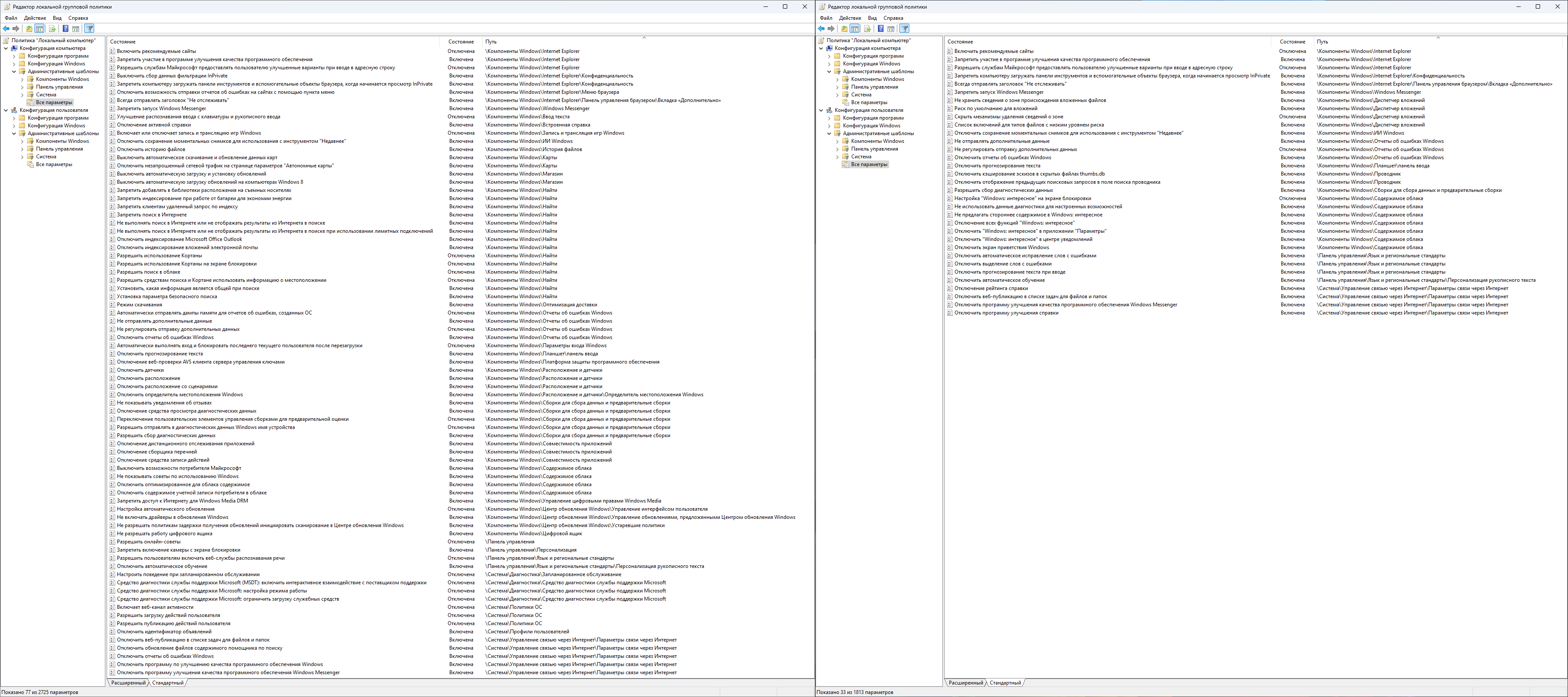 - Отключено/Удалено: WindowsDefender, SmartScreen, WindowsMediaPlayer