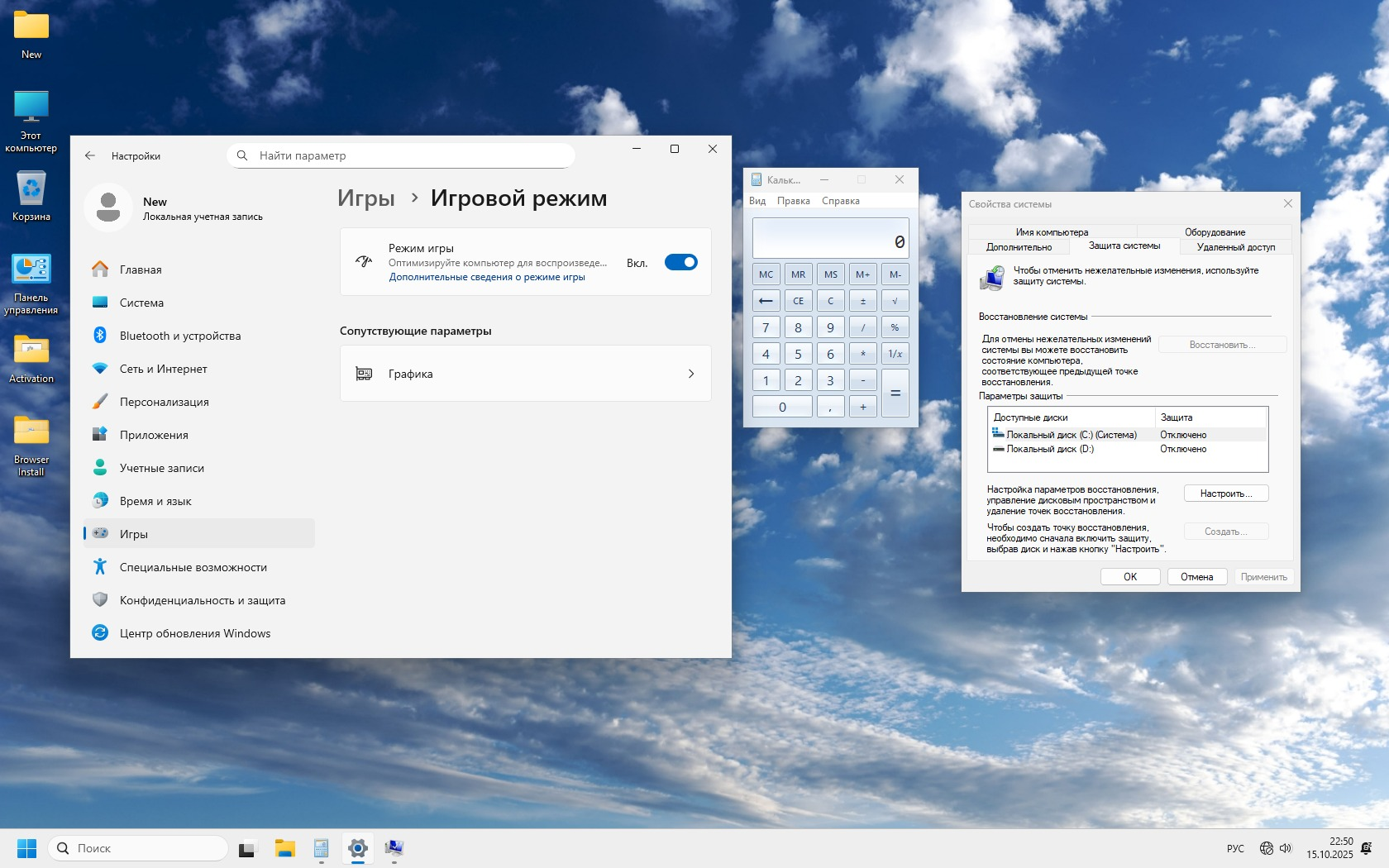 - Брандмауэр отключен — работает в режиме автоодобрения; UAC переведен на режим автоодобрения; браузер Yandex отключен, остальной системный блок отключен для экономии места на жестком диске.