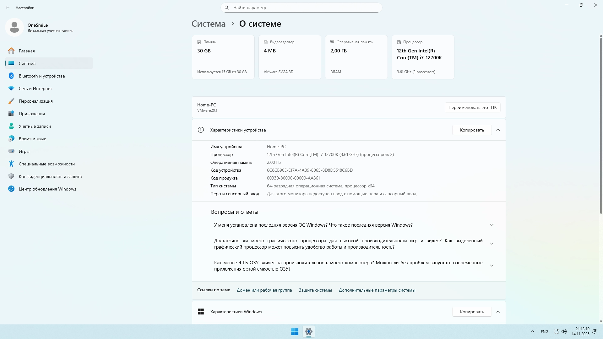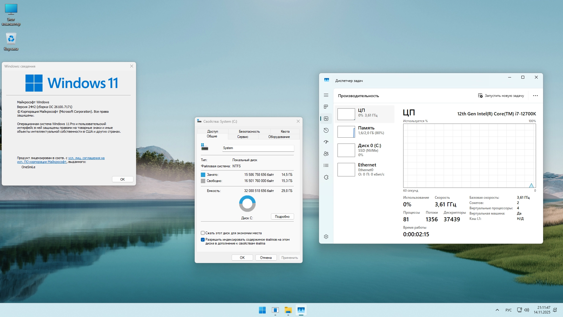Сборка Windows 11 Pro версии 24H2, создаваемая на основе исходных образов, содержит обновления с датой выпуска 14.11.2025. Компьютер поддерживает процессоры двух и более ядер с частотой не менее 1 ГГц или SoC, со свободной ОЗУ до 4 ГБ. Устанавливается без модерна приложений и телеметрии, включая Defender, Edge и Microsoft Teams.