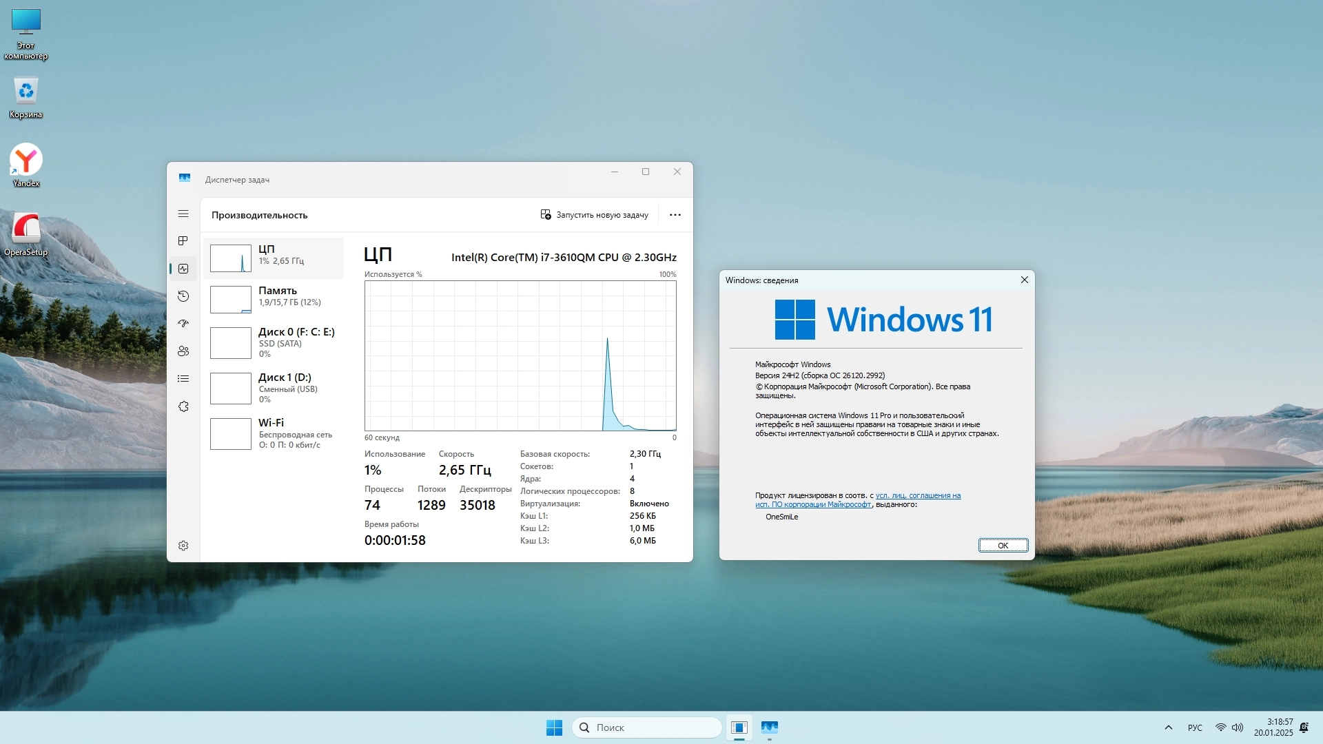 Windows 11 Pro Русская by OneSmiLe 24H2 build 26120.2992: Версия 24H2, подготовленной для России, с обновлениями по Январь 2025 года и системным требованиями для процессоров на две ядро с частотой не менее 1 ГГц или SoC и ОЗУ до 4 ГБ. Видеоадаптер должен поддерживать DirectX 12 и выше, диск от 20 ГБ, экран 720p с диагональю свыше 9 дюймов. Без телеметрии, защитника Windows и стандартных приложений.
