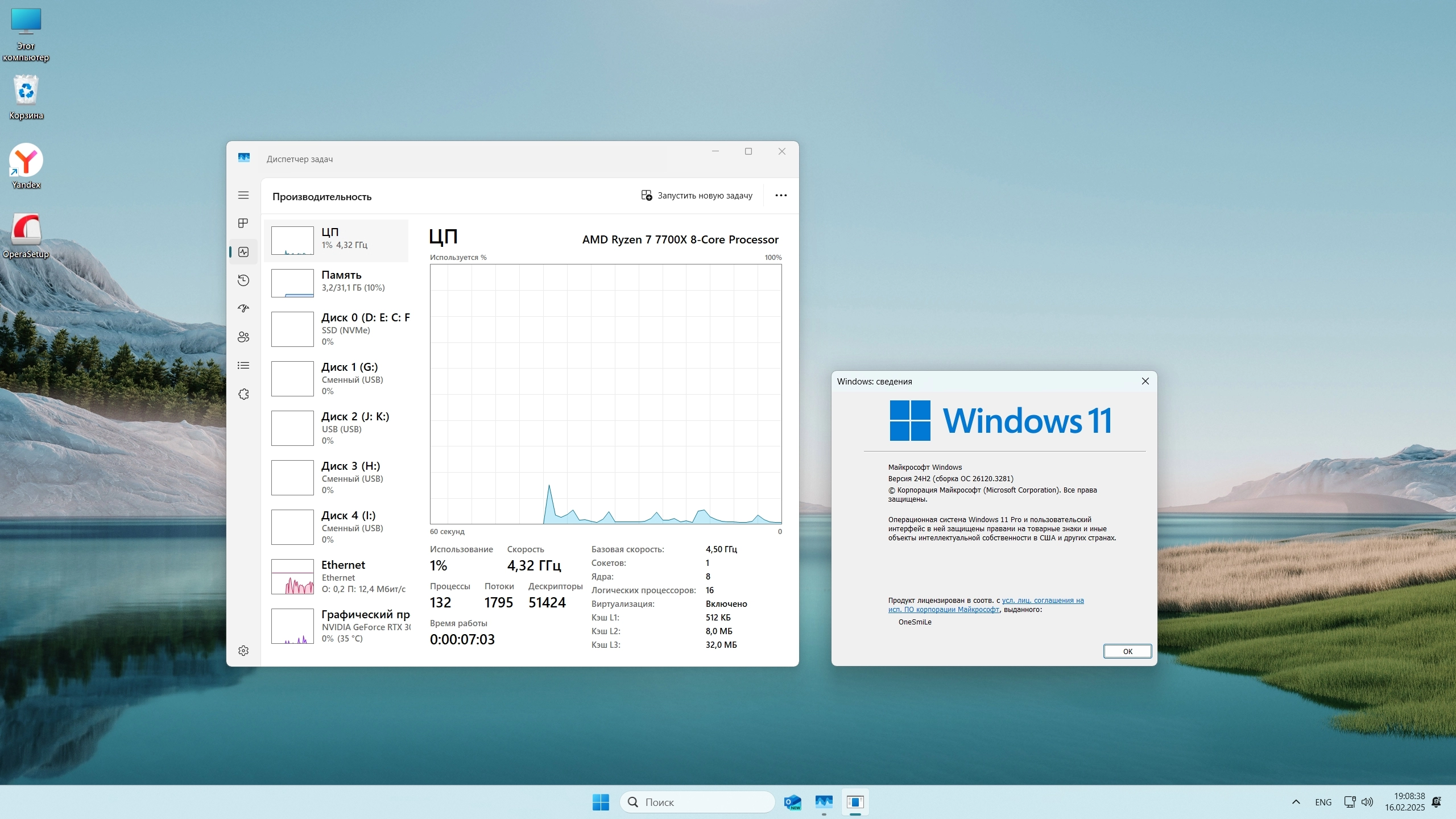 Windows 11 Pro на русском языке, созданный из оригинальных образов с обновлениями до 16 февраля 2025 года. Процессор не менее двух ядер и тактовой частоты 1 ГГц или SoC, 4 ГБ ОЗУ, минимум 20 ГБ местом на диске.