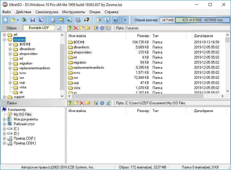 служба Центра обеспечения безопасности все языки кроме ru и en Отключены службы Про обновления Кумулятивные обновления устанавливаться не будут никак ни в ручном, ни через ЦО Запись на USB Шаг № 1. Откройте образ сборки в программе UltraISO. Для того чтобы записать образ сборки на флешку через программу UltraISO вам нужно сначала открыть этот образ. Для этого запустите UltraISO, откройте меню «Файл» и выберите там пункт «Открыть». В результате перед вами появится стандартное окно для выбора файла. Здесь вам нужно выбрать ISO файл с образом сборки, который вы хотите записать на флешку. После этого в интерфейсе UltraISO появятся файлы из выбранного образа диска. Данные файлы лучше не трогать, иначе загрузочная флешка может не работать. Шаг № 2. Подключаем флешку к компьютеру и запускаем запись образа. Дальше вам необходимо подключить к компьютеру флешку, на которую вы планируете записывать образ сборки через UltraISO. Для этого просто подключите флешку к любому USB порту и дождитесь, пока система ее определит. После подключения флешки вернитесь к программе UltraISO. Теперь вам нужно открыть меню «Самозагрузка» и выбрать пункт «Записать образ диска...». После этого откроется окно для записи образа диска. Здесь вам необходимо выбрать флешку, на которую вы хотите записать образ. Выберите нужную флешку, и нажмите на кнопку «Записать». После этого программа UltraISO предупредит об удалении всех данных с флешки и в случае согласия пользователя, начнет запись образа на флешку. Шаг № 3. Дождитесь, пока UltraISO закончит запись образа. Теперь вам осталось дождаться, пока UltraISO запишет образ сборки на флешку. Обычно это занимает всего несколько минут. После завершения записи, загрузочная флешка со сборкой Windows 11 Pro x64 Lite 22H2 build 22622.590 by Zosma будет готова. Рекомендации: 1. UltraISO желательно запускать от имени Администратора. 2. Лучше выставлять галочку напротив пункта «Проверка», это займет лишние несколько минут (Обычно не больше 5), но зато Вы будете уверены, что запись пройдет успешно. На рабочем столе Папка с Modern Tweaker