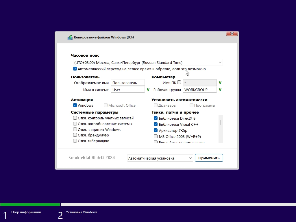 - Активация Windows (Office): Если подобран подходящий ключ для редакции Windows, он автоматически устанавливается при первой настройке системы.