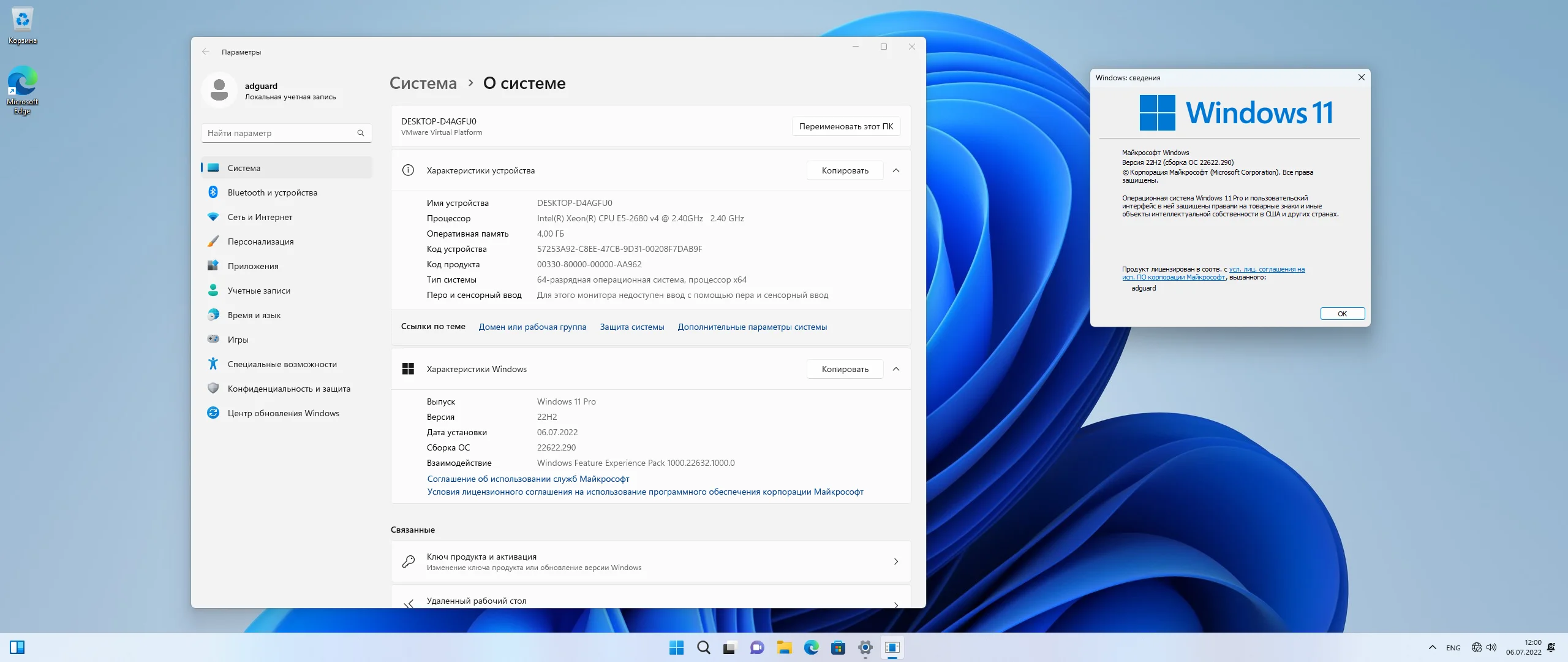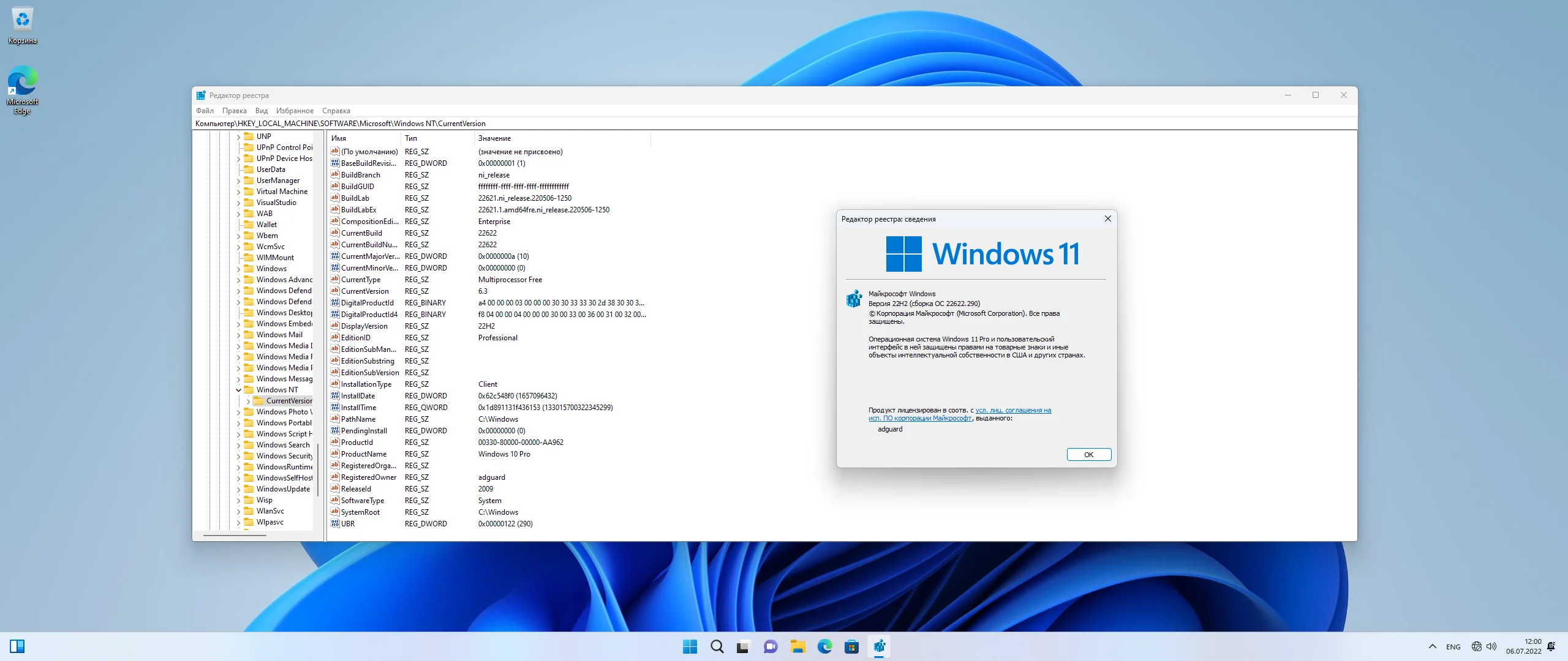 This version of Windows is not marked for auditing and system integrity has been disabled. It includes updates from July 5, 2022, SmartFix 2.4.7, and Microsoft DaRT in wim files like winre.wim and boot.wim. The system is not being audited during installation or update processes.