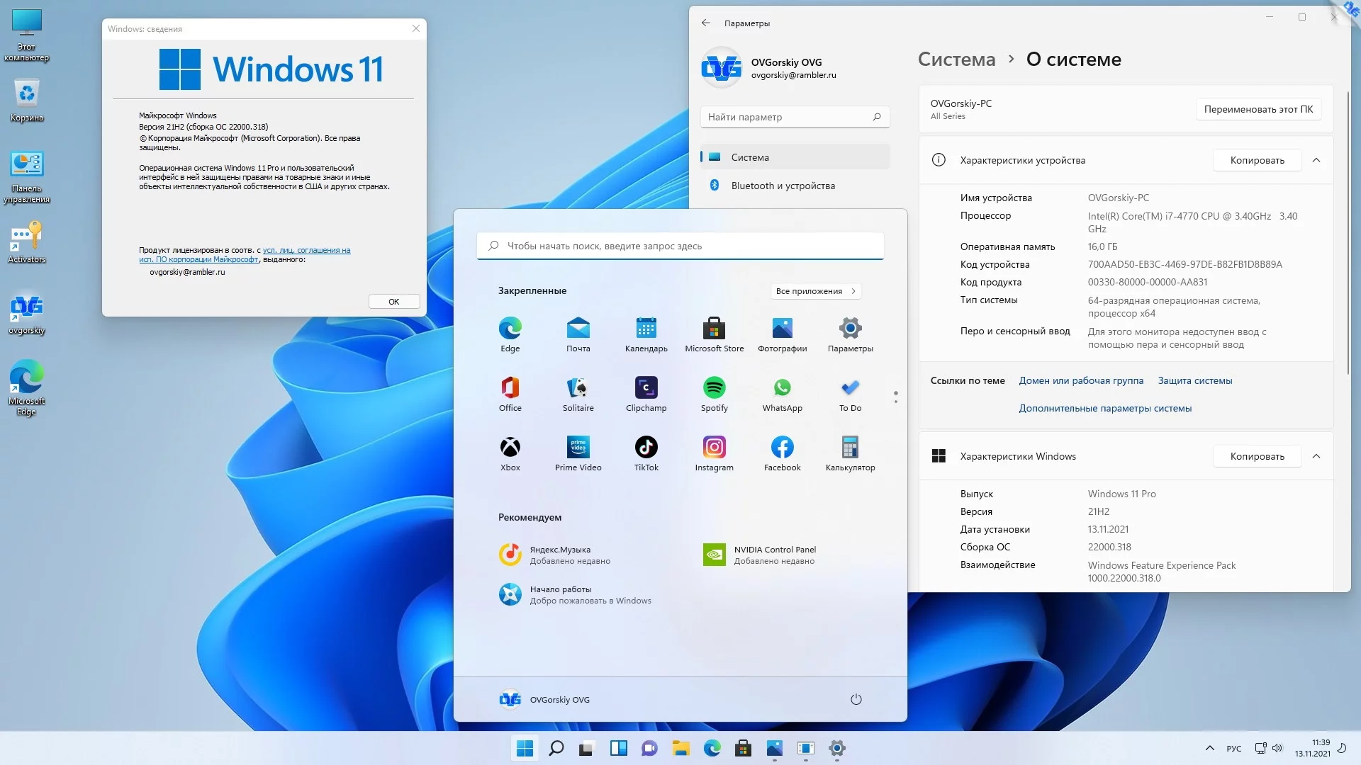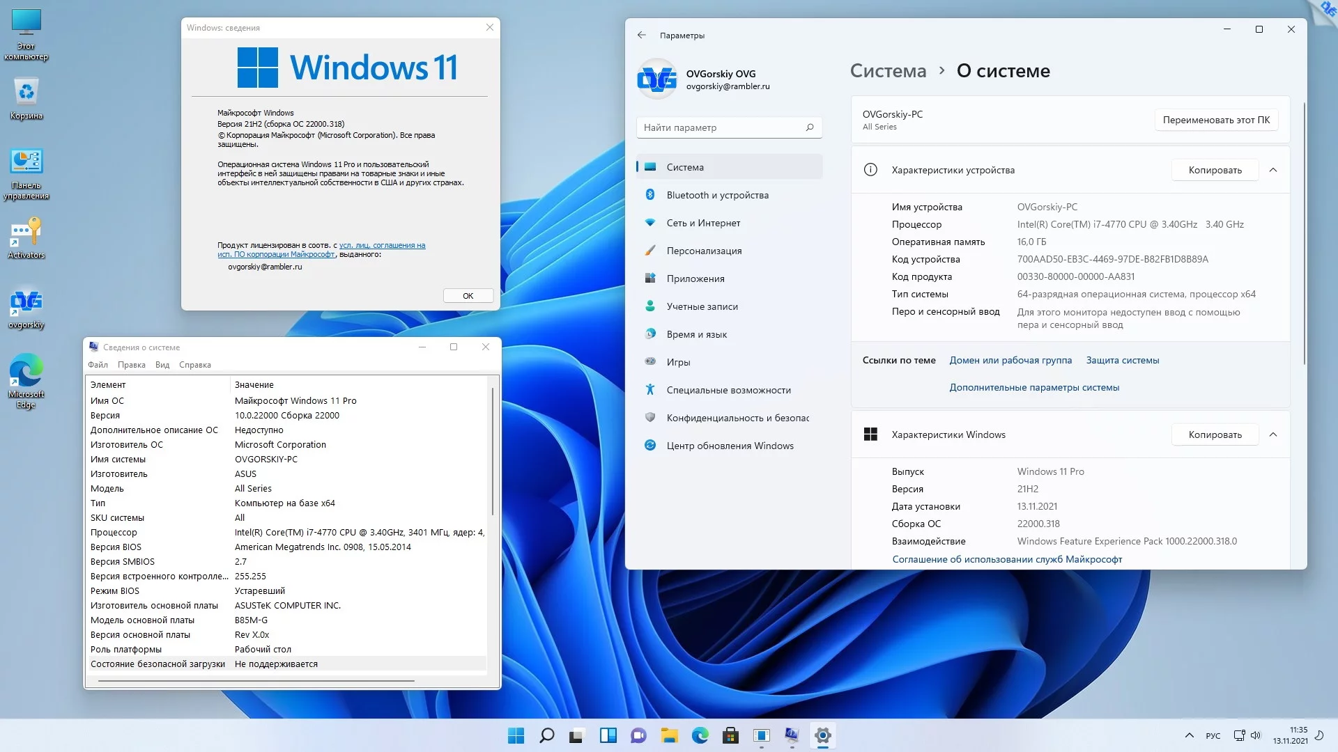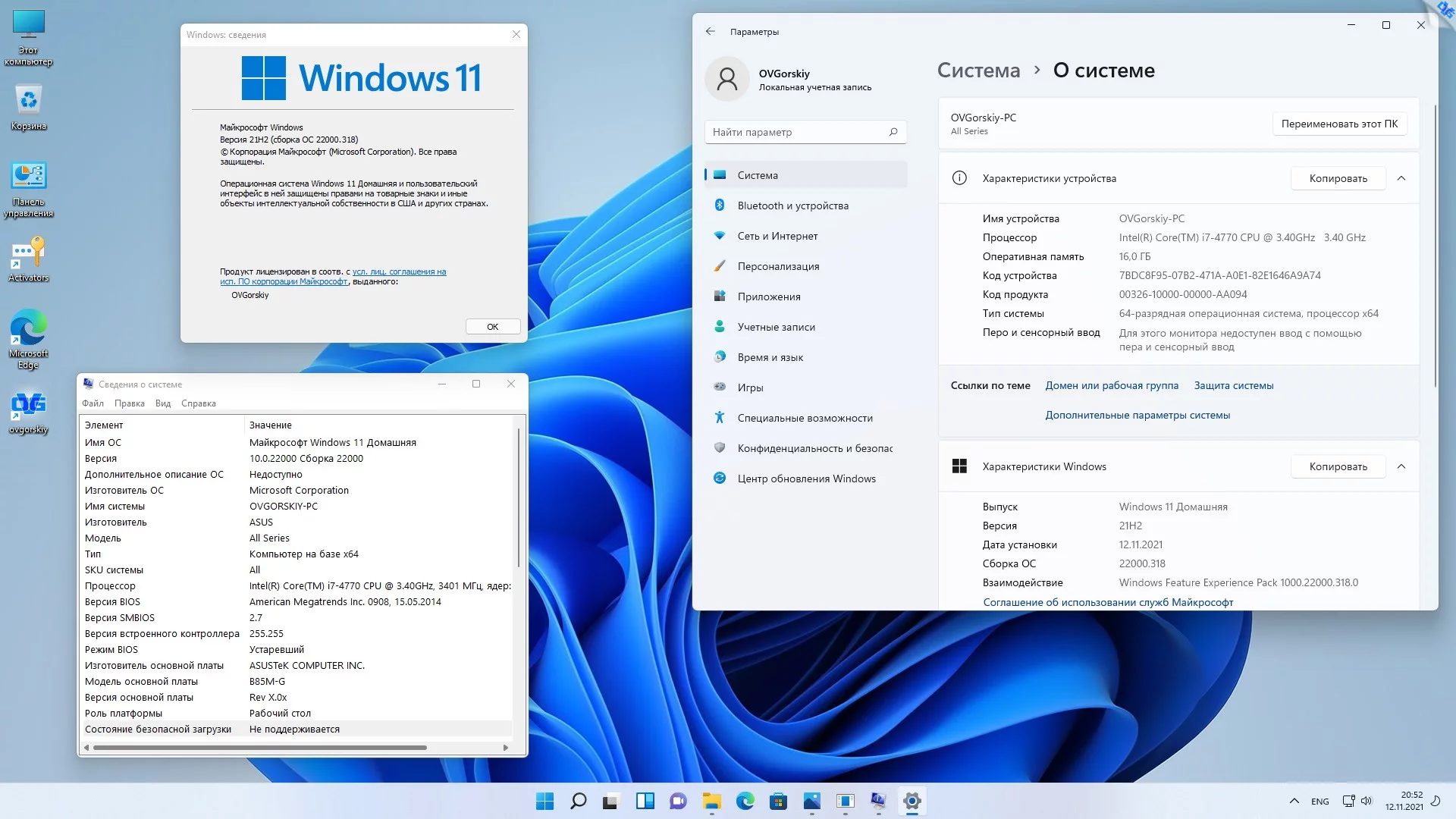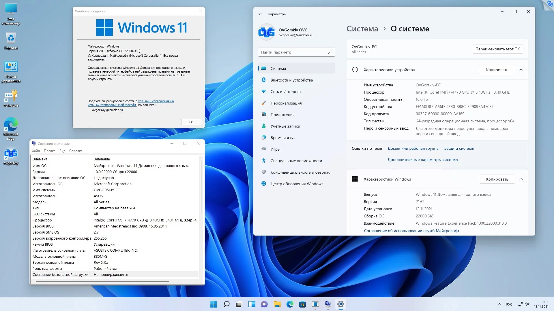 Версия системы 10.0 build 22000 (21H2) October 2021 Release (10.0.22000.318)