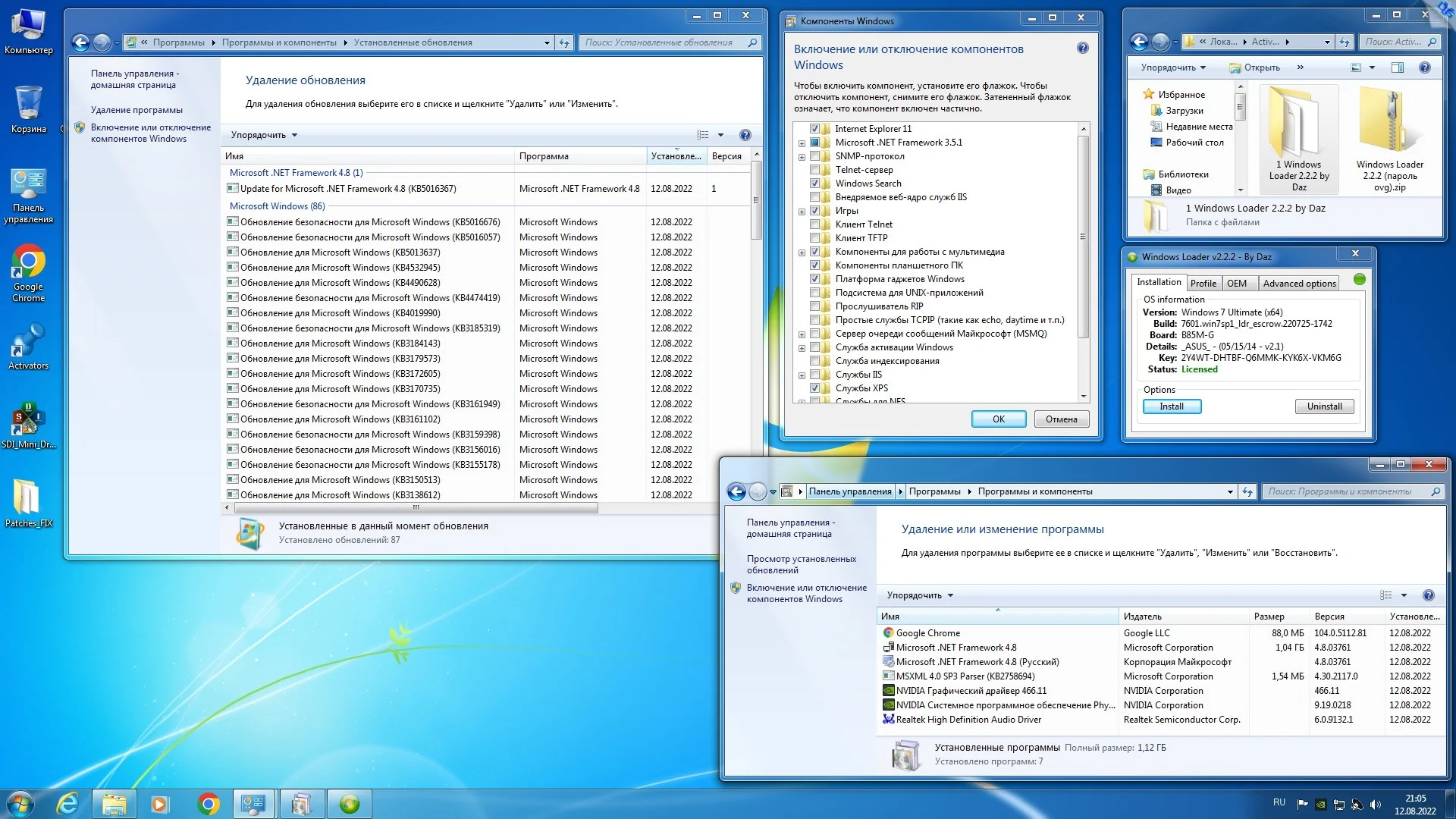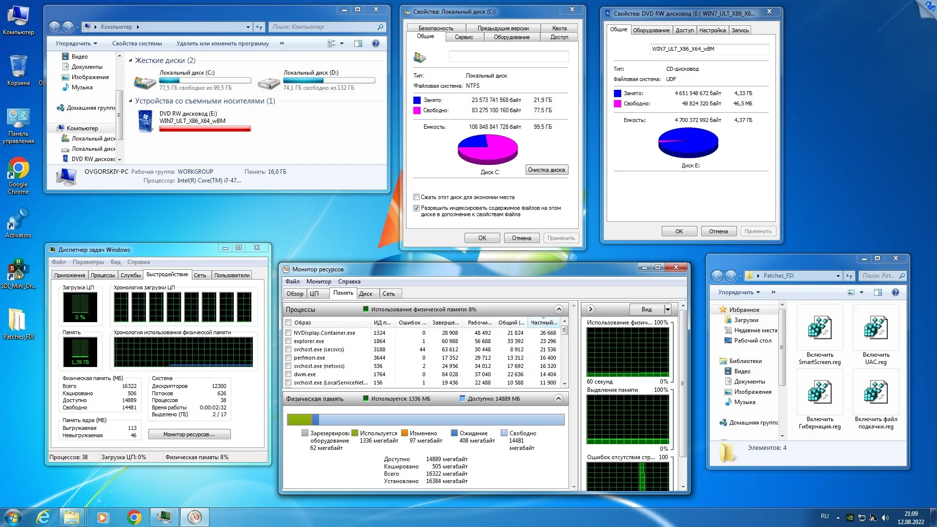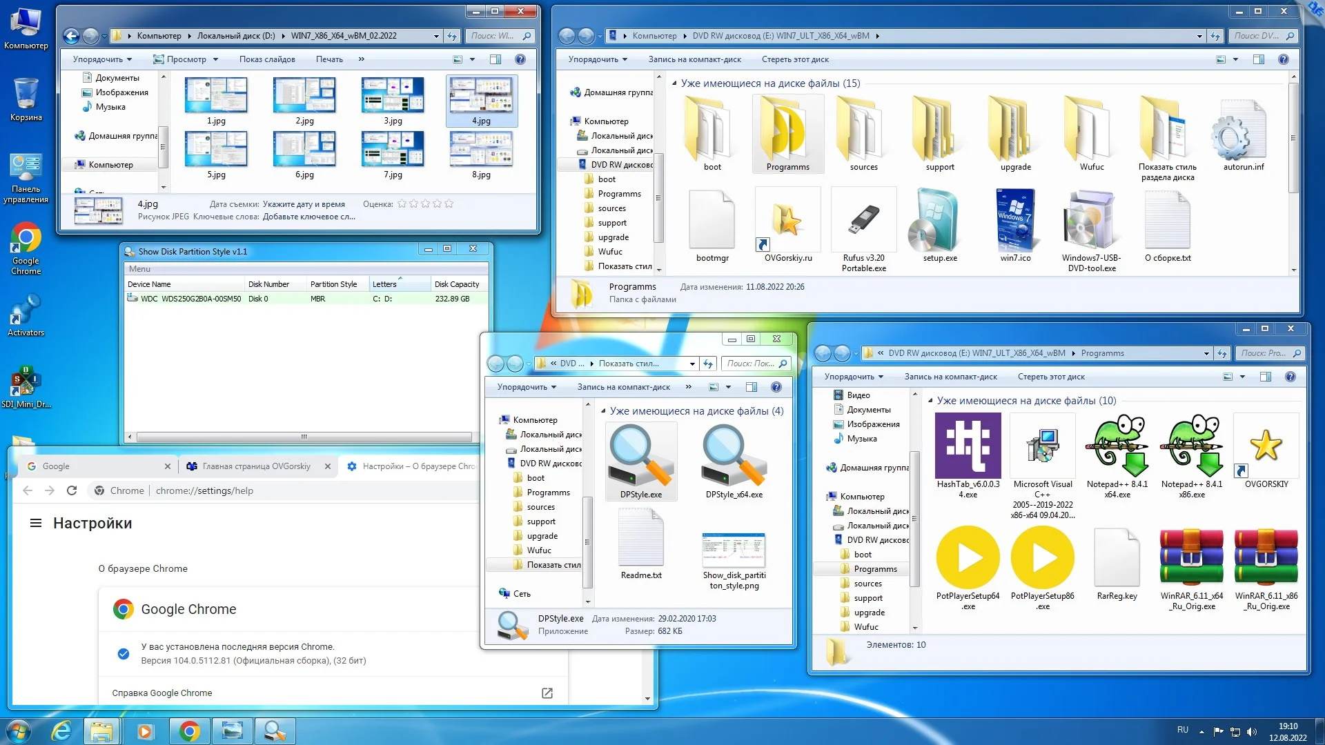 - Процессор: 1 гигагерц (ГГц) или выше с поддержкой PAE, NX и SSE2 (32 или 64-битный для x86, 64 битный для x64); - Оперативная память (ОЗУ): 1,2 гигабайта (для 32-разрядной системы) или 2 ГБ (для 64-разрядной системы) с поддержкой DDR3; - Пространство на жестком диске: 18 гигабайт (для 32-разрядной системы) или 25 ГБ (для 64-разрядной системы) с доступом только по ближайшей адресации. Windows 7 Максимальная Ru x86-x64 w.BootMenu by OVGorskiy 08.2022 1DVD торрент, изменения: Интегрированы: важные и рекомендуемые обновления по август 2022 г. включительно и Internet Explorer 11 ru x86/x64, отключена телеметрия, произведена небольшая настройка системы для удобства в работе. Сборка разработана по многочисленным просьбам тех, кому необходима чистая система после установки, и вопросы оформления готов заняться сам. Всё это предоставляет данная сборка, система, максимально приближенная к оригиналу и небольшое количество дополнительного материала для ручной установки и большой набор инструментов для работы с компьютером и ОС с установленным носителем. Сборка предназначена для установки из под начальной загрузки компьютера с загрузочного носителя на диски с MBR структурой. Образ не предназначен для установки из под существующей ОС и на компьютерах с GPT системным диском. Сборки основаны на официальных образах MICROSOFT MSDN: ru_windows_7_ultimate_with_sp1_x86_dvd_u_677463.iso ru_windows_7_ultimate_with_sp1_x64_dvd_u_677391.iso Автоматически устанавливаемые приложения в процессе установки ОС: - Google Chrome 103.0.5060.114 Stable (альтернатива браузера IE11). - Microsoft .NET Framework 4.8 (4.8.4545.3) Ru с обновлениями по август 2022 г. Содержимое образов можно перенести на загрузочную флешку или записать на DVD диск, согласно соответствующей процедуре создания загрузочных носителей (см. примечания). Примечания и важные рекомендации: 1. Образ не предназначен для установки из под установленной ОС методом обновления. Сборка не предназначена для установки на диски с GPT структурой, если вы используете такую систему диск. Установка операционной системы ничем не отличается от оригинала, за исключением выбора редакции установки. Время установки ОС варьируется от 10 до 40 минут в зависимости от разрядности и мощности компьютера.