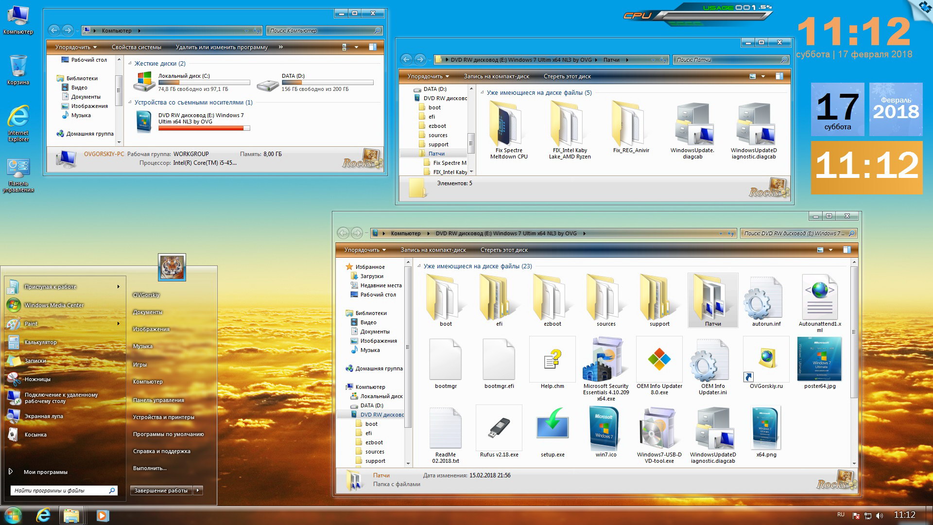 13. В самом установочном образе добавлены программы для смены информации производителя в свойствах системы OEM Info Updater, программы для создания флешки и файл помощи по установке системы. Так же в образ добавлена папка с патчами системы, инструменты для работы с исправлениями Spectre Meltdown CPU, патч для процессоров Intel Kaby Lake и AMD Ryzen, твик реестра, испрвляющий не установку накопительных обновлений из за антивируса. Желающие могут установить антивирус от Microsoft, Security Essentials.