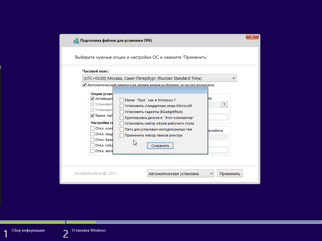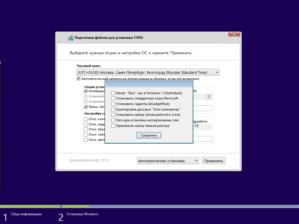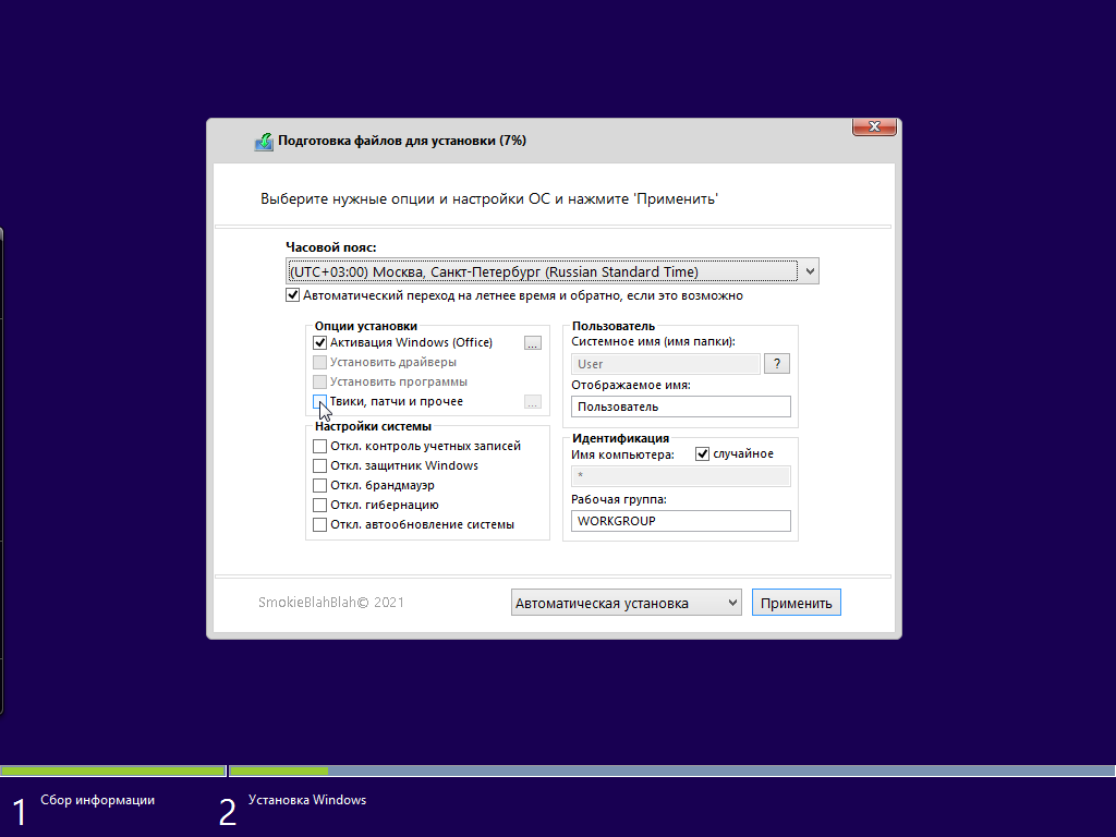 При распаковке файлов ОС, в установленный раздел компьютера, появляется интерфейс Настройка установки.