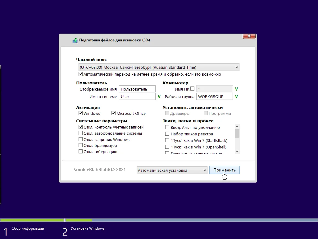 - Настройка установки во время распаковки ОС
