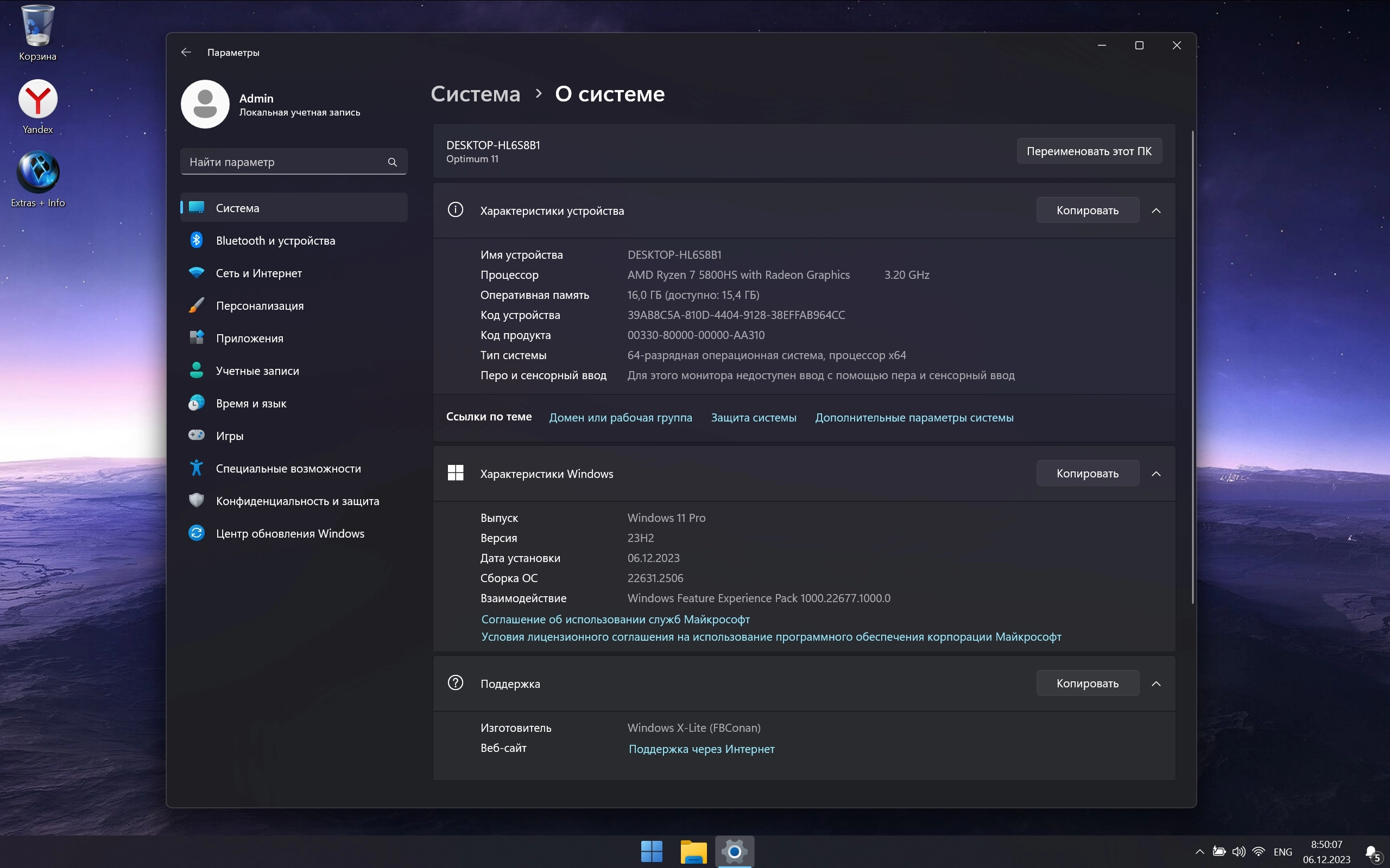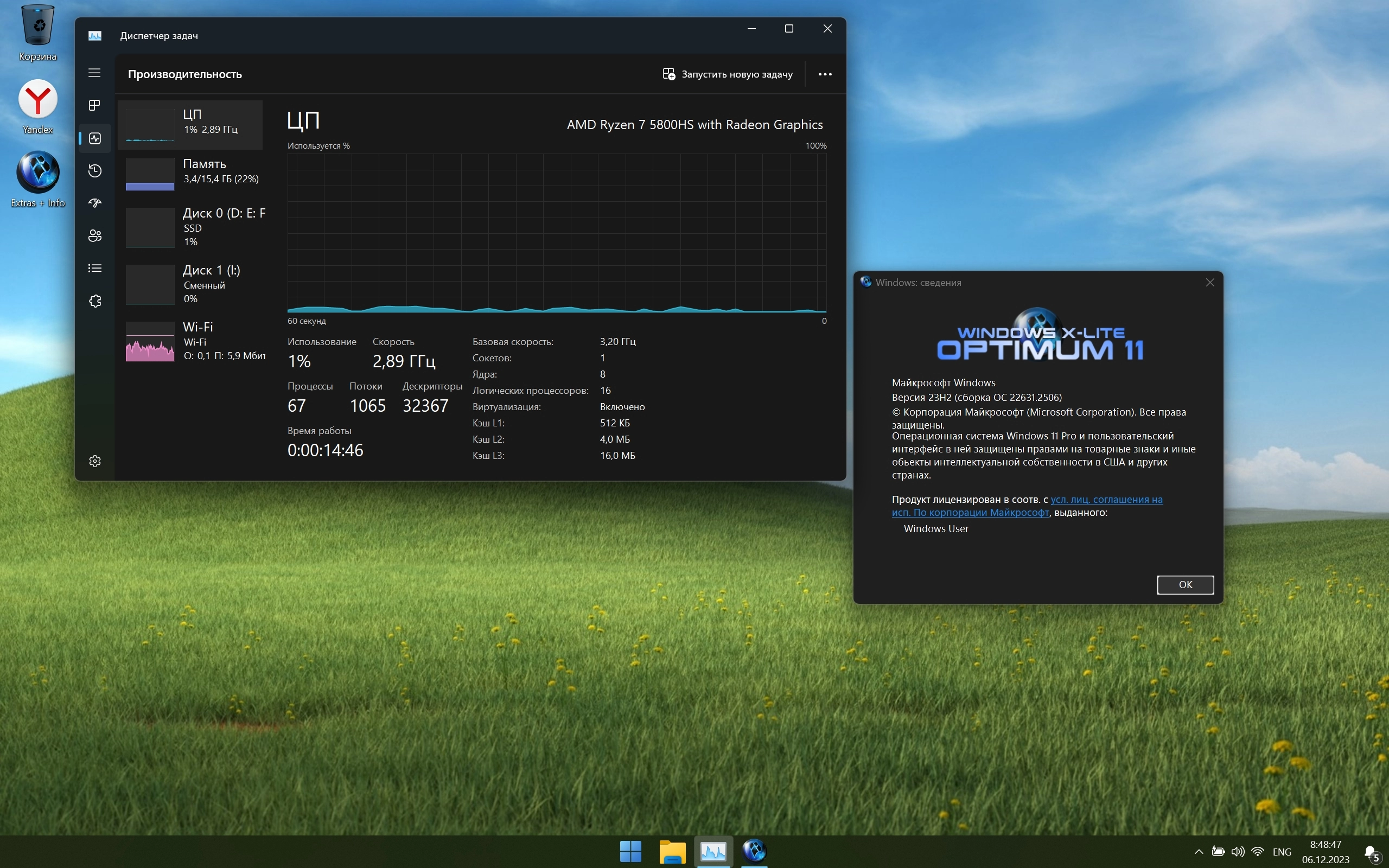 Версия 23H2 Build 22631.2506 Сборка Windows Optimum 11 Pro дает вам больше свободы и контроля, предлагая установку с Windows Defender или без него, а также возможность установить Edge и виджеты. Компьютер для системы: Процессор: не менее двух ядер с тактовой частотой не менее 1 гигагерца (ГГц) или SoC ОЗУ: 4 гигабайта (ГБ). Видеоадаптер: DirectX 12 или более поздней версии с драйвером WDDM 2.0 Экран: (720p) с диагональю более 9 дюймов, 8 бит на цветовой канал SecureBoot и TPM 2.0 не требуется.