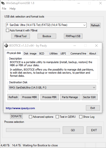 Несмотря не небольшой размер программа содержит в себе еще ряд полезных инструментов, среди которых FBinstTool (форматирование носителя, создание резервных копий, управление структурой), BOOTICE (управление загрузочными секторами жесткого диска), RMPrepUSB (инструмент для управления разделами), ImDisk, MbrFix и Grub4dos Installer.