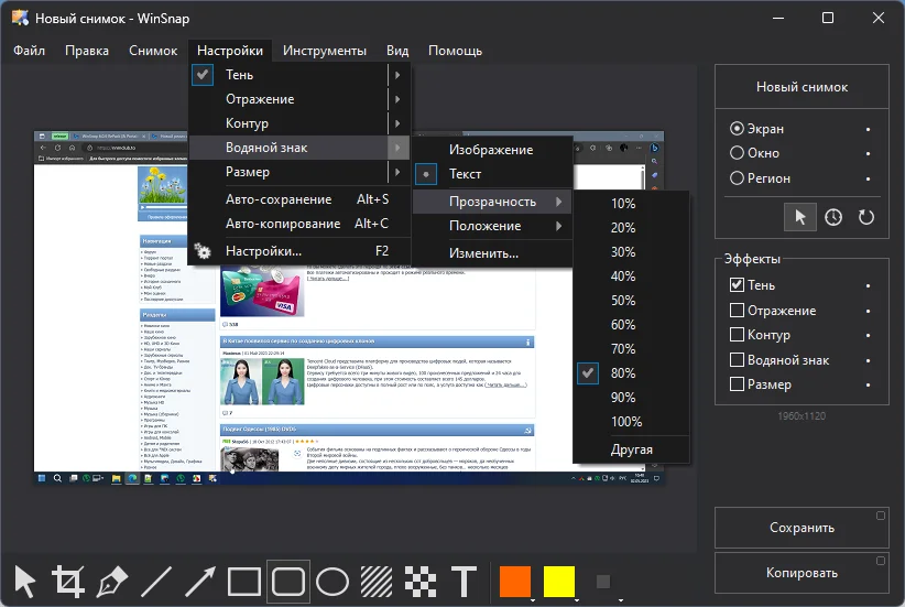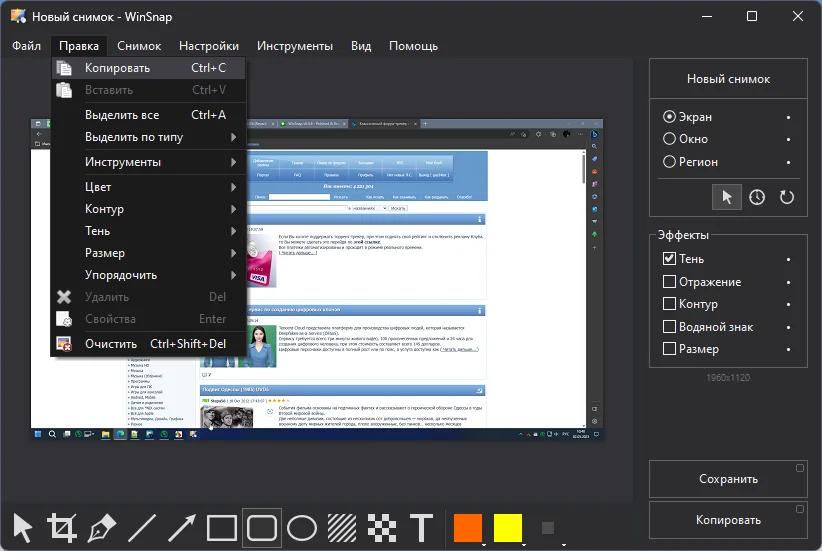 WinSnap 6.0.6 RePack (& Portable) by elchupacabra — это мощный и удобный инструмент для создания и обработки скриншотов. Программа позволяет быстро захватывать изображение всего экрана, активного окна, отдельного объекта или произвольной области. WinSnap 6.0.6 RePack (& Portable) by elchupacabra выделяется поддержкой захвата окон нестандартной формы и возможностью мгновенного редактирования полученных снимков.