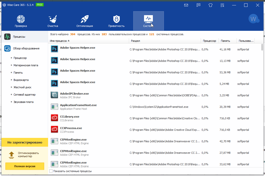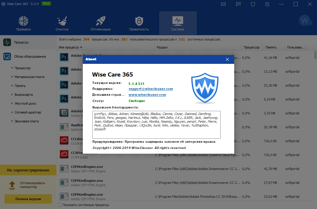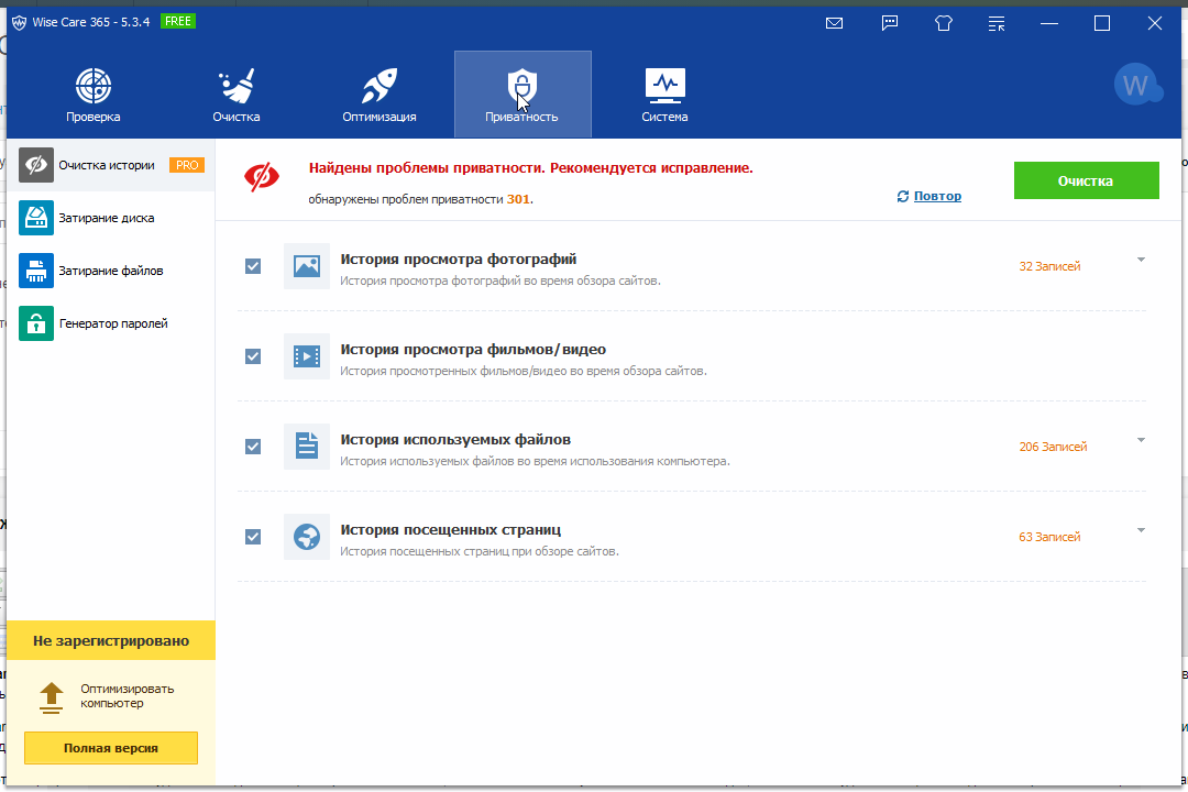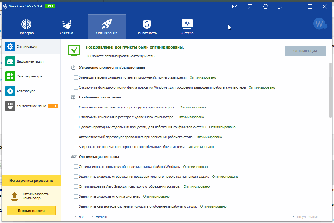 Wise Care 365 - это бесплатный программный комплекс, набор инструментов, который позволяет сохранять операционную систему компьютера чистой, безопасной и поддерживающей максимально возможную для вашего компьютера скорость работы. (на слабых компьютерах не стоит ждать чудес.)