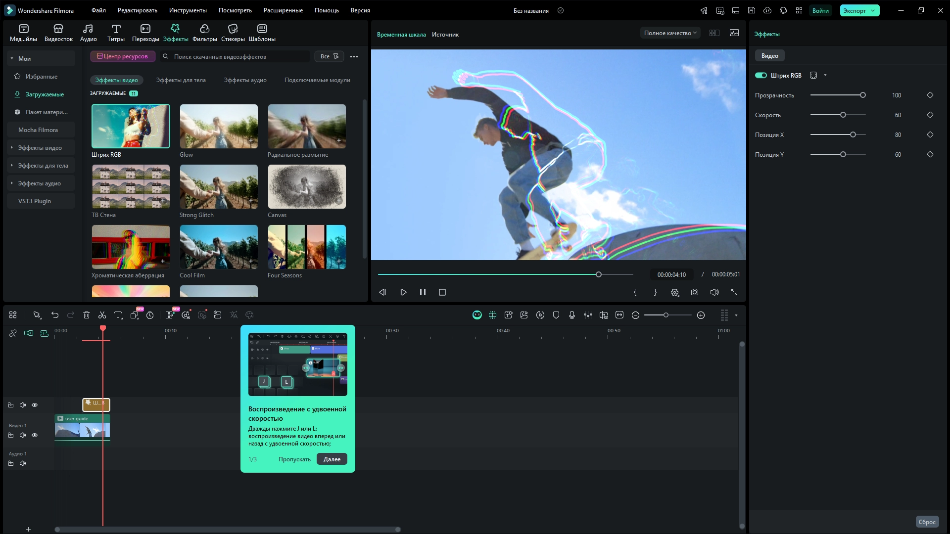 - Применение эффектов перехода между клипами и анимации к фотографиям для создания плавных и естественных склеек.