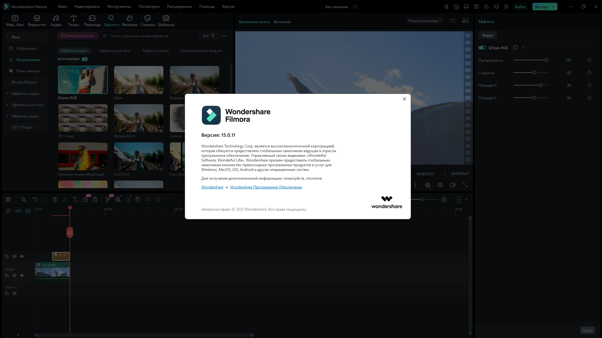 Wondershare Filmora 15.0.11.16306 by 7997 представляет собой удобный и функциональный видеоредактор, который содержит все необходимые инструменты для создания качественного видеоконтента. С его помощью можно монтировать фильмы, добавлять титры, применять визуальные фильтры и эффекты перехода, а также обрабатывать звуковую дорожку.